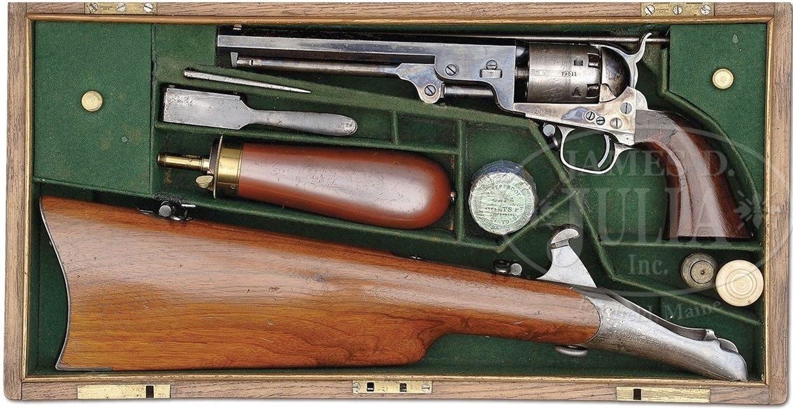 Нельзя не отметить, что первые револьверы (да и последующие, если быть честными до конца) были часто достаточно массивными и сделать точный выстрел из такой штуковины достаточно сложно. Поэтому часто револьверы дополнялись специальными "удобствами". Одним из самых распространённых "удобств" был съёмный приклад, который превращал револьвер в лёгкий карабин. Вот такой комплект Кольта Драгун: