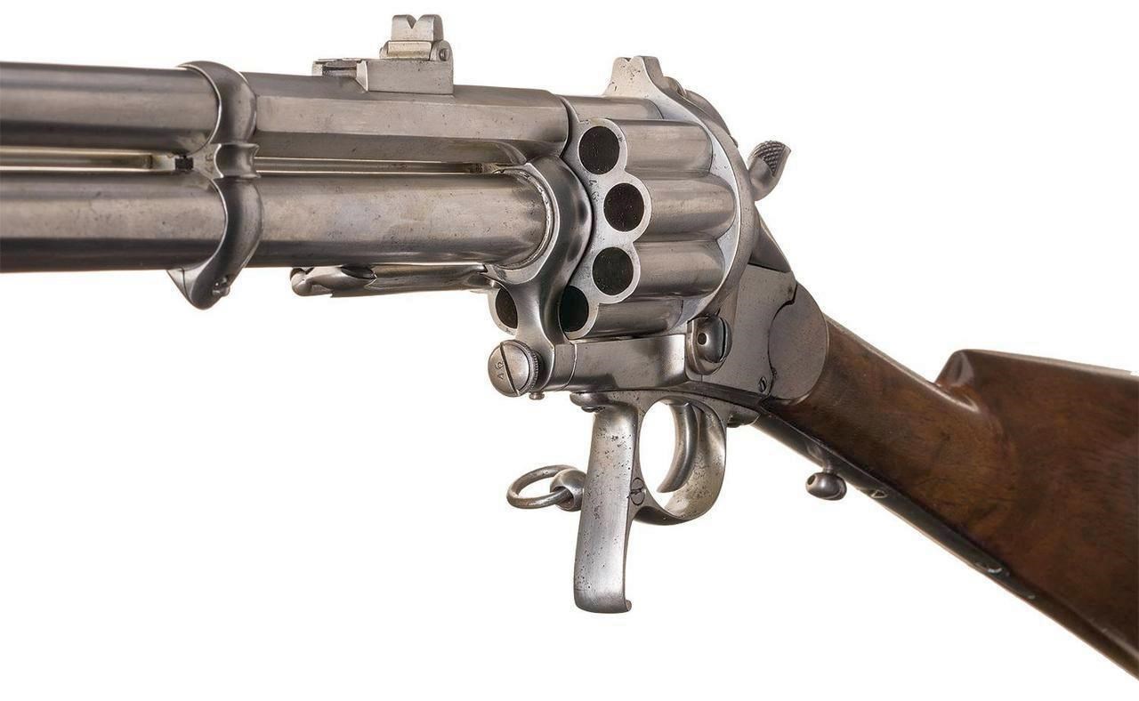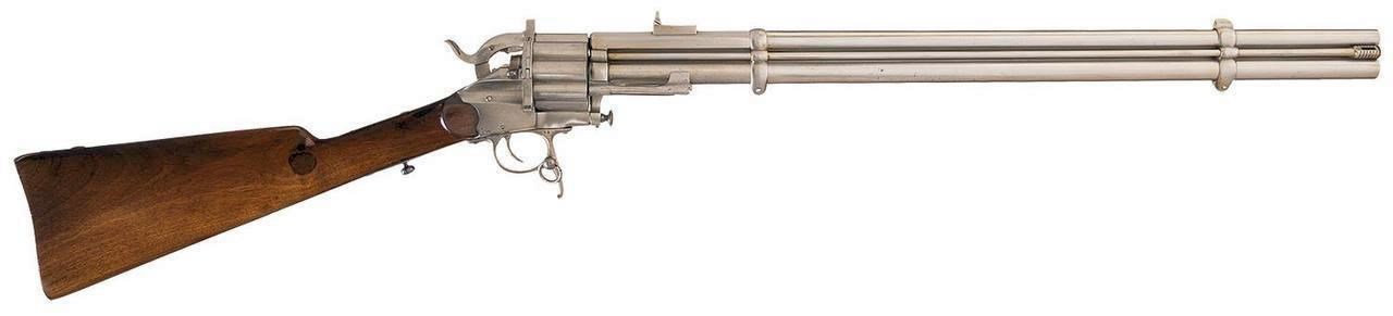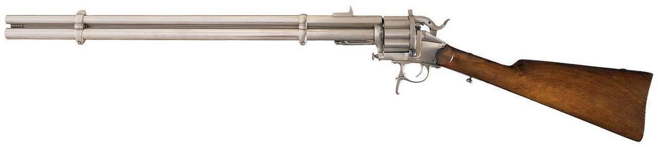 Я уже говорил про съёмные приклады для мощных револьверов, которые предлагали своим клиентам практически все известные производители оружия. Но часто они просто делали на основе своих револьверов "настоящие" карабины с использованием механизма револьвера. А такой револьверный карабин Кольта даже стоял на вооружении американской армии. Вот такой револьверный двухствольный карабин образца 1870 года на основе револьвера Ле Ма: