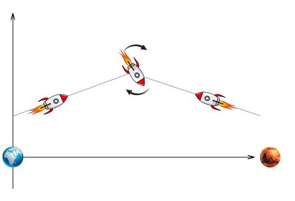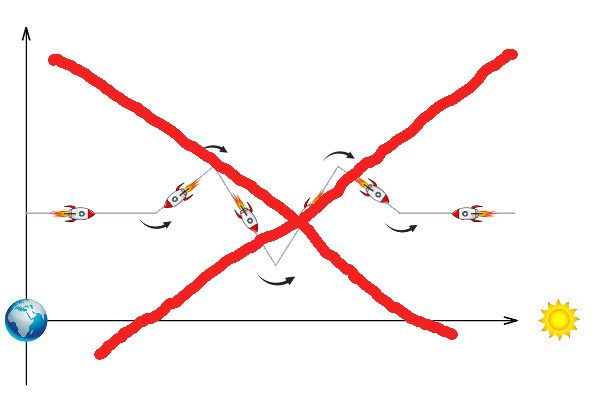 Если у ракеты неограниченный запас топлива (то есть её двигатель может работать постоянно, и горючее никогда не кончится), то самая правильная схема полёта вот такая: