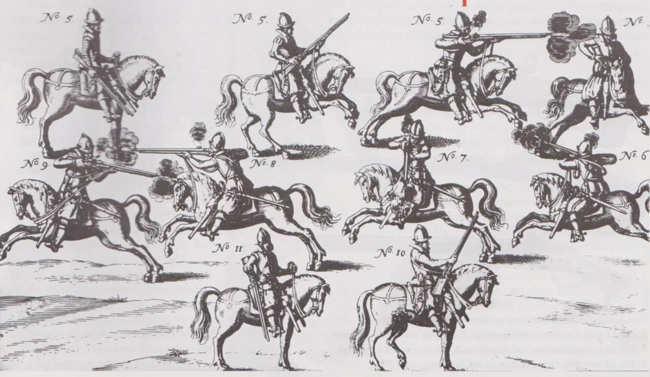 Конный аркебузир в десяти основных положениях. Гравюра из «Военного искусства конницы» Иоанна Якоби фон Вальхаузена, изданного в 1616 году.