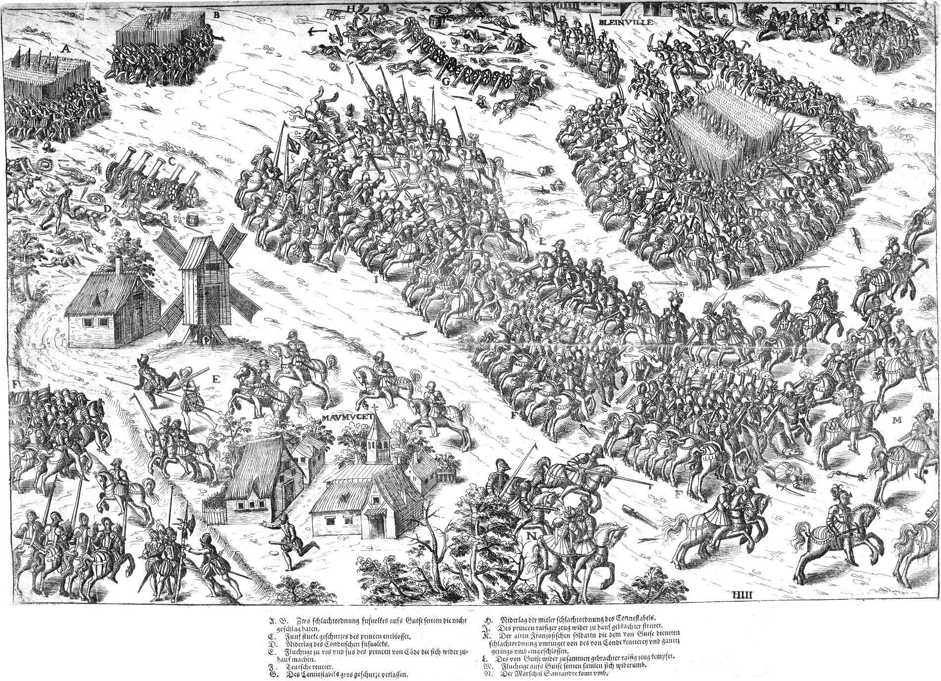 Битва при Дрё, важнейшее сражение Первой гугенотской войны. Гравюра Тортореля и Перриссина, опубликованная в 1588 году. Есть целый цикл гравюр про эту битву.