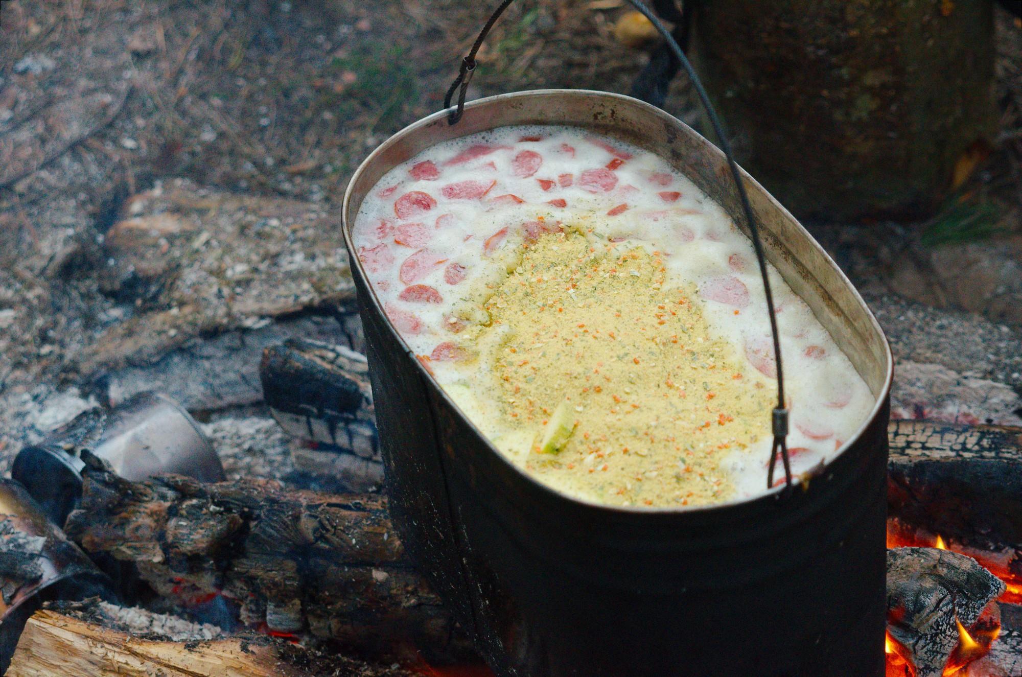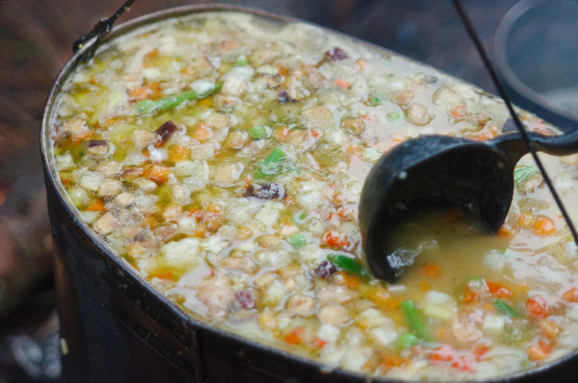 Вариант второй – сухой концентрат супа в вариантах. Аналогично засыпаем в кипящую воду, докидываем необходимый объем тушёнки, возможно риса, размешиваем и варим минут двадцать до готовности, после чего стоит отставить на полчасика-час настояться и можно выдавать. Хотя голодным можно и сразу выдавать. Сожрут за милую душу.