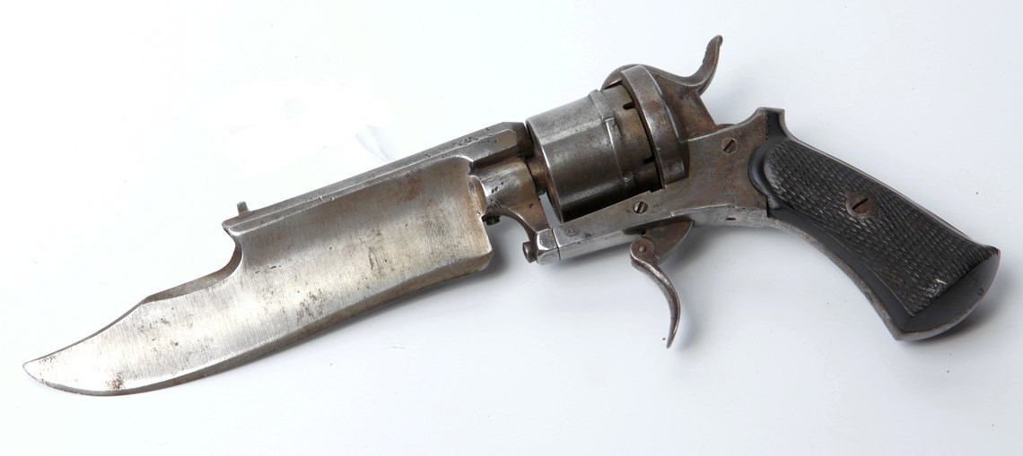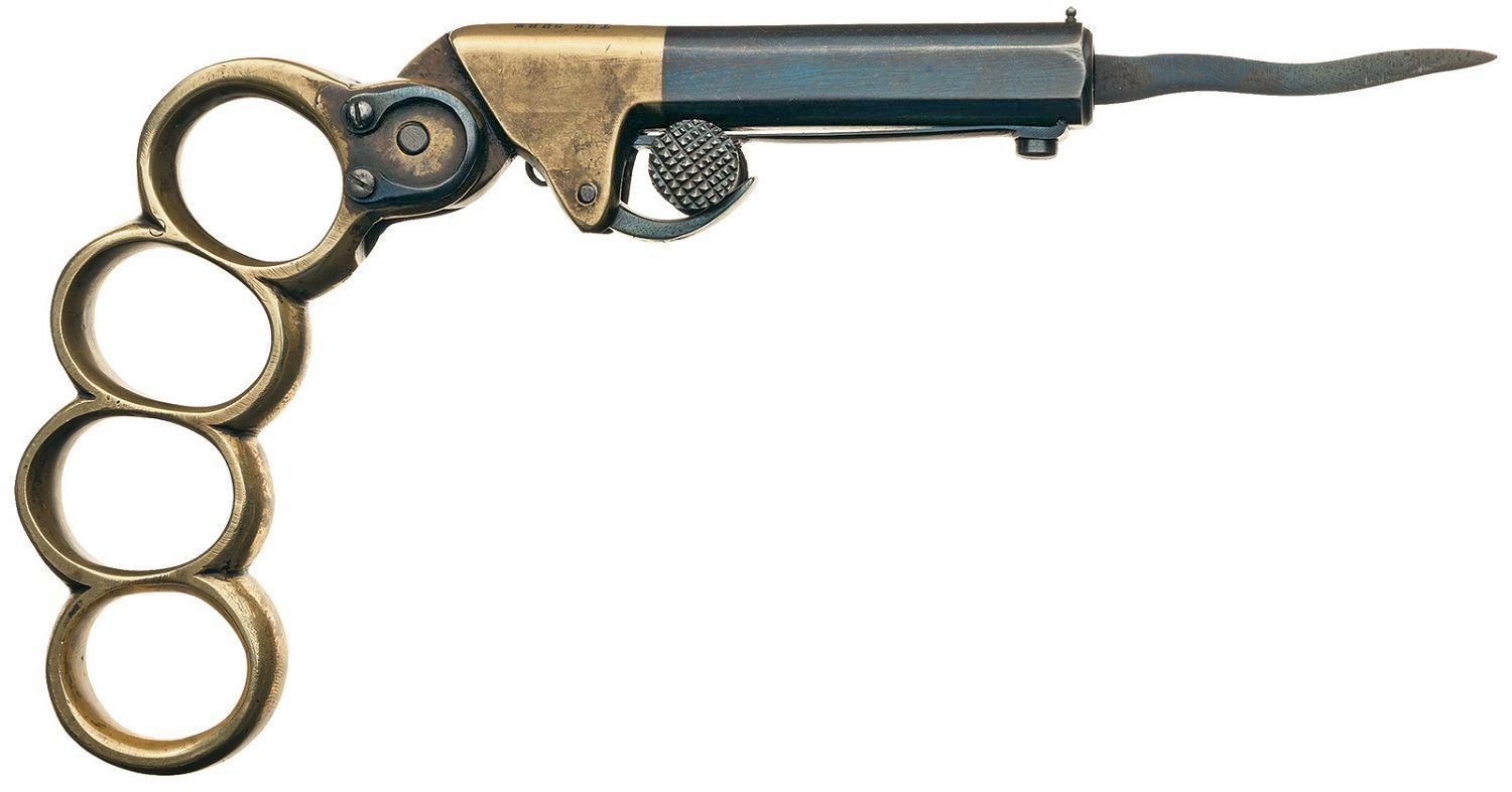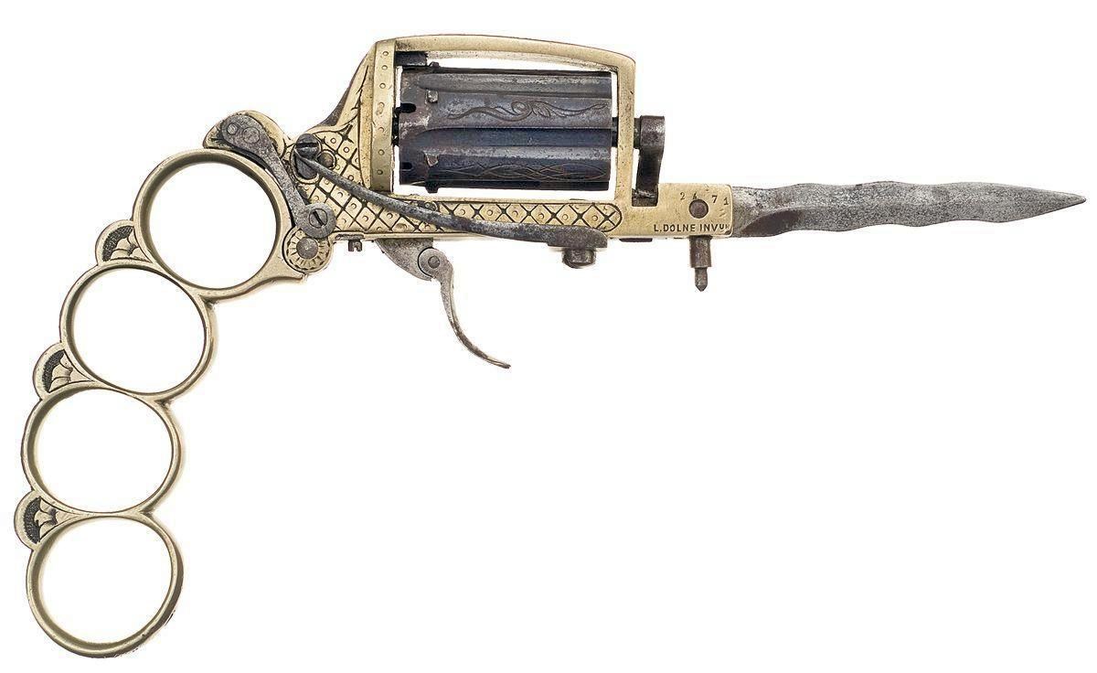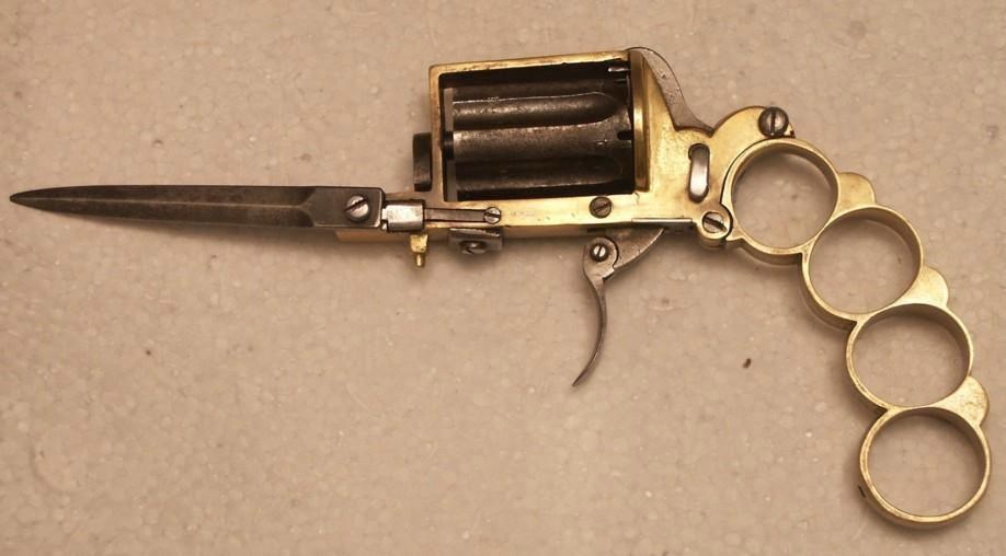 Хотя, с другой стороны… Вот в конце 19 и начале 20 века жила-была всякая мелкая шпана. Её вообще везде хватало, но в французском городе Париже её оказалось так много, что нашёлся среди них один, который так и не смог выбрать, с какой железякой он будет круче выглядеть перед другими мелкими уголовниками. И решил он, что нужно брать всё и в одном флаконе. Пошёл к мастерам и ему сделали складной револьвер-нож-кастет! Правда ножик получился "не очень", но это всё-таки лучше, чем вообще никакого, особенно в сочетании с кастетом. Вышел он с этой штукой на улицу, показал подельникам… я через пару недель пожалел – чуть не у всех такие штуки сразу появились. В общем всем стало плохо, кроме того, кто этими штуками торговать стал. Но и ему было непросто – количество конкурентов было просто огромным. Такие штуки стали по всему миру клепать. В основном – револьверы, вот они: