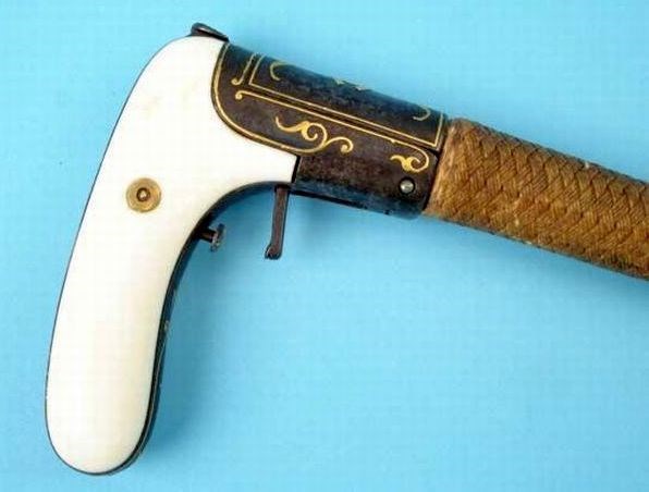 Мужикам с их «джентльменским набором» вообще с оружием было попроще. Например трости носили с собой не для того, чтобы компенсировать какие-то издержки в разделе «опорно-двигательного» комплекта, данного природой, а именно, как оружие. Ну и, конечно, его совершенствовали как могли – трости-шпаги, стреляющие трости – всё это было достаточно распространено. Также поступали и с зонтиками – принцип-то один и тот же: