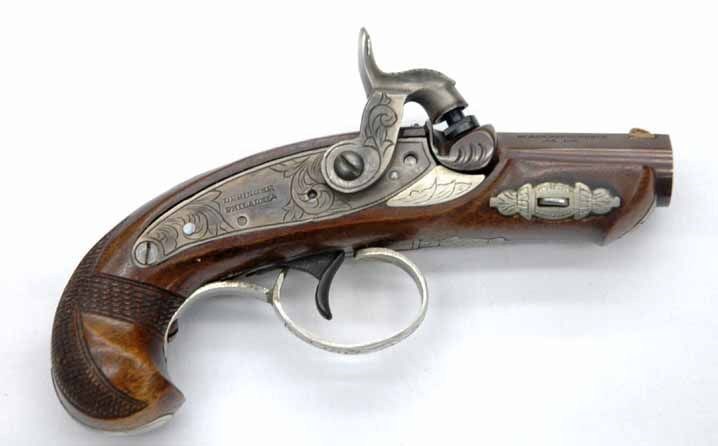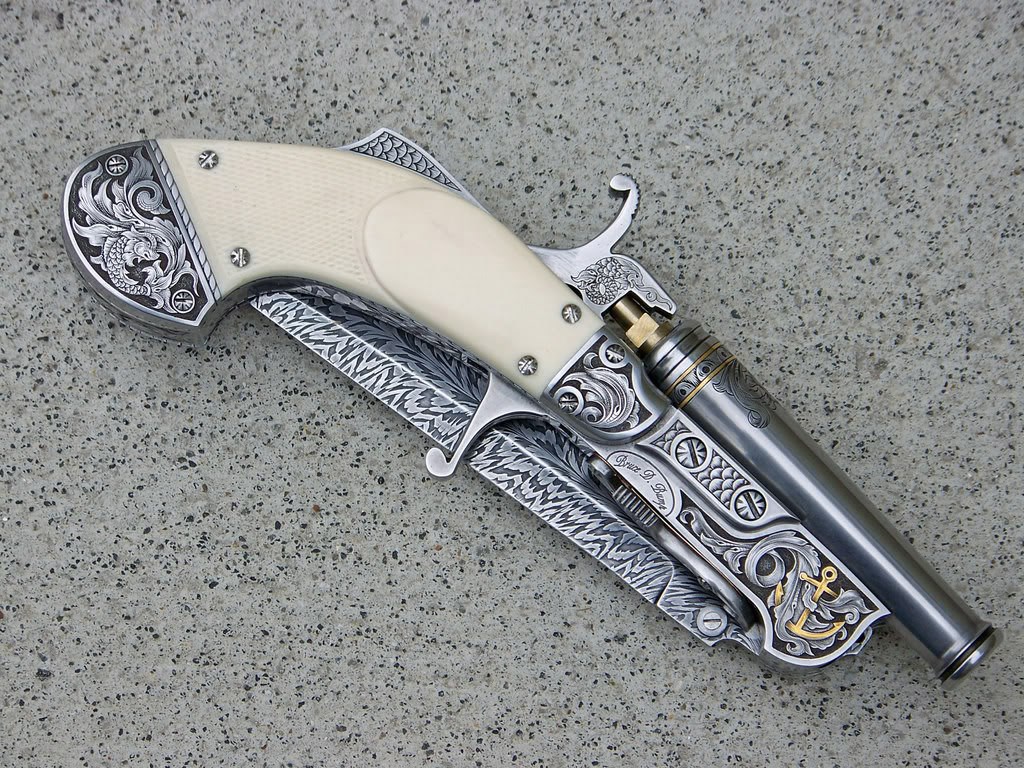 Хотя на крайний случай были ещё и «жилетные» пистолеты. Один из таких даже стал именем нарицательным. Их до сих пор делают все, кому не лень. Я говорю про многоликий «дерринджер». Первый пистолет этого типа был сделан в Америке оружейником Генри Деринжером и предложен покупателям в 1830 году. Выглядел он в "подарочном исполнении" примерно вот так. Хотя ручаться не могу - вряд ли сейчас наверняка можно сказать, как выглядел "тот самый первый":
