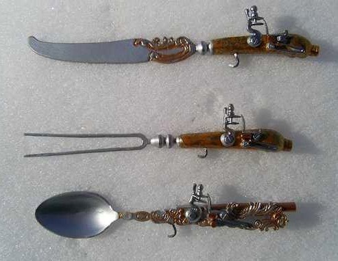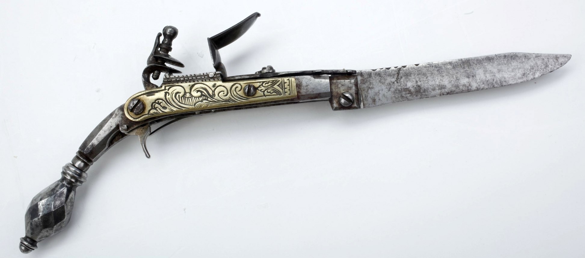 В старину-то понятное дело – не лезвия приделывали к стрелялке, а наоборот – стрелялку к лезвию. Ведь как было-то? Курок нажал – совсем не значит, что выстрелил – с надёжностью было плохо. А если выстрелил, то не значит, что попал. Короче проще привычно – кинжалом супротивника разделать. Вот таким вот ножиком, на котором ствол просто на всякий случай – а вдруг получится?