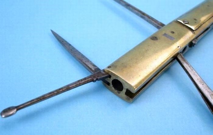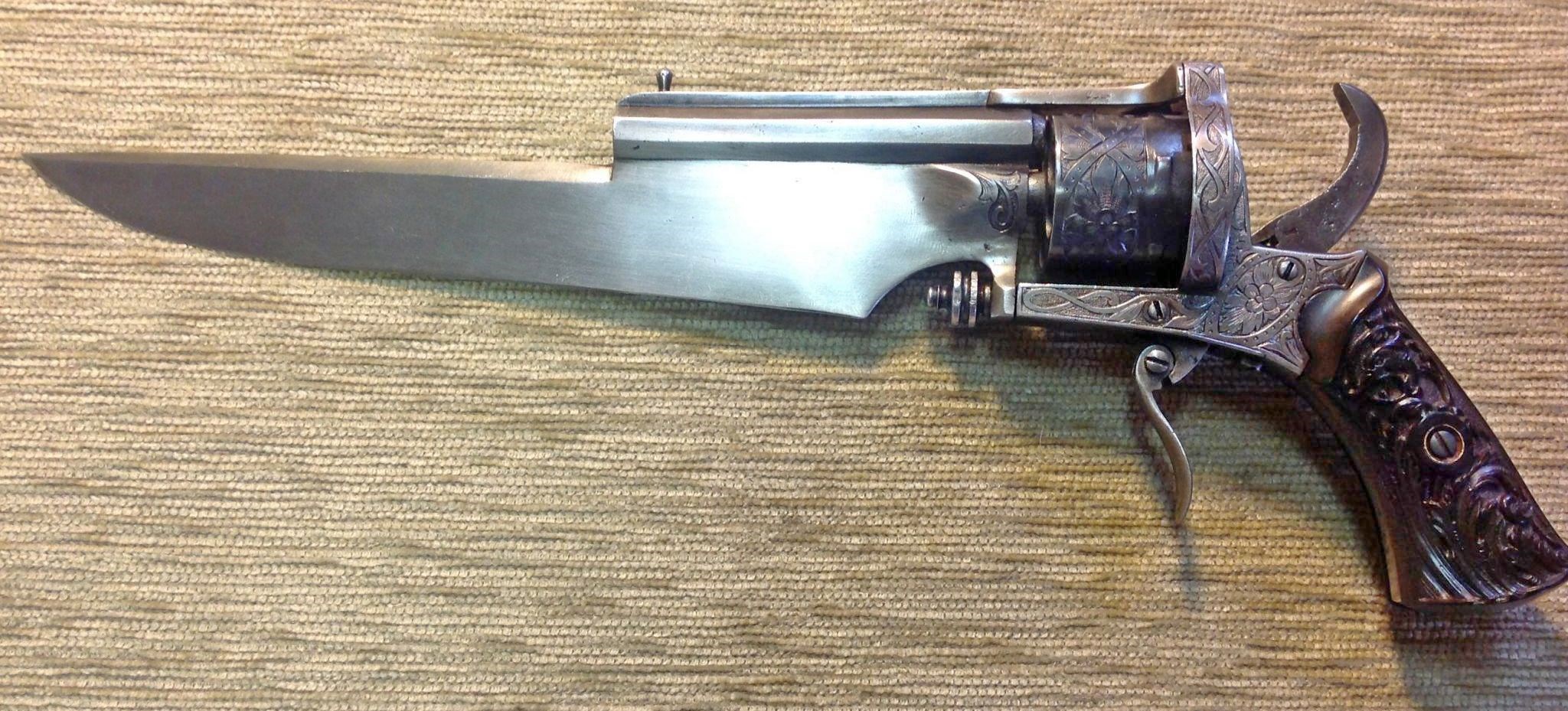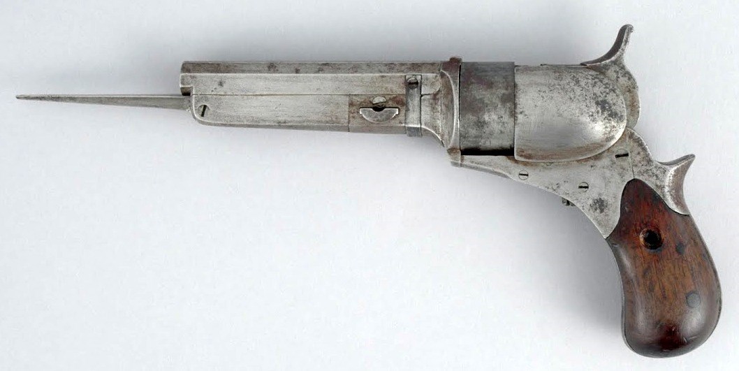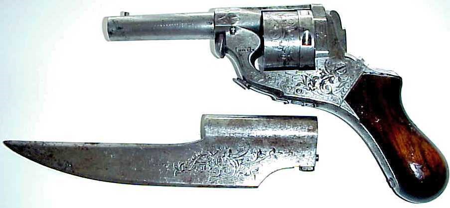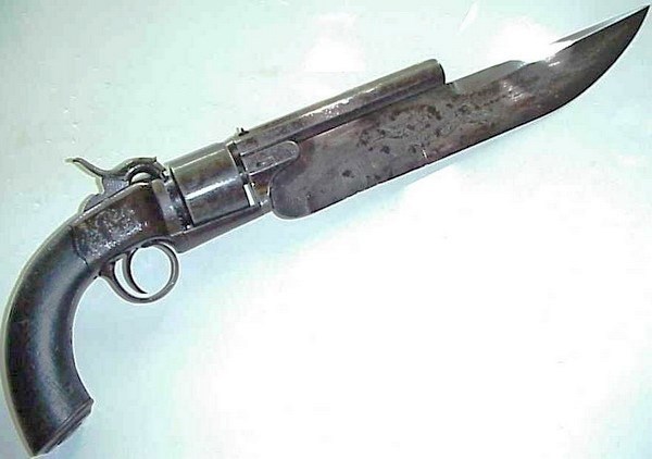 Дальше я постараюсь не говорить про что-то совсем экзотическое и эксклюзивное, сделанное в одном экземпляре. Буду говорить только про те штуки, которые выпускались в достаточных количествах, то есть проверенные временем и людьми. Это – надёжнее. Самое простое, хотя сейчас уже забытое настолько, что даже в кино не встречается – пистолет со штыком. Да, сейчас штык сохранился только на более серьёзных стрелялках типа автомата, но когда-то штыками и пистолеты почти повсеместно снабжали. Причина и появления, и исчезновения пистолетного штыка проста – изменились боеприпасы. То есть, когда пистолеты были ещё кремнёвыми и капсюльными, то на их перезарядку требовалось много времени, а где его взять, если противник быстро бегает? Не будет супостат ждать пока вы свой кольт перезарядите 15-20 минут. Вот и присобачивали сплошь и рядом к высокотехнологичному револьверу архаичный ножик. Таких много было… Вот такие, например: