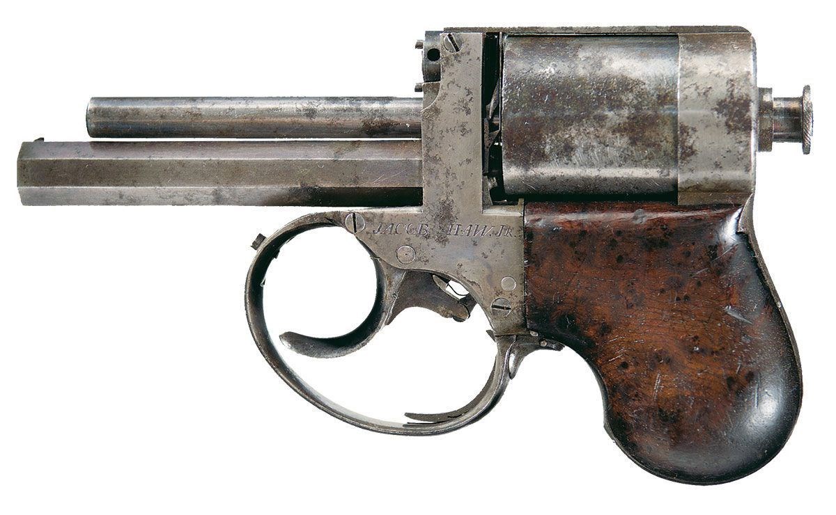 Иногда мини пистолеты пытались совершенствовать с целью сделать их более эффективными. Вот на этом жилетном пистолете (Jacob Shaw 1853 г.) ствол перенесли вниз, чтобы отдача при выстреле была менее «злой», а ось барабана выполнили в виде трубки для прицеливания… сомнительное решение: