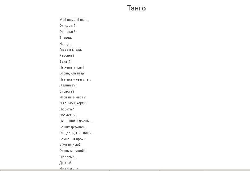 В стихах много поэтических находок, неожиданных образов. Например, в «Танго» развитие отношений между людьми сравнивается с танцем, и это действительно очень впечатляет. Пожалуй, это стихотворение мне понравилось больше всего, и хочется привести полный его текст, чтобы все смогли оценить его оригинальность и выразительность.