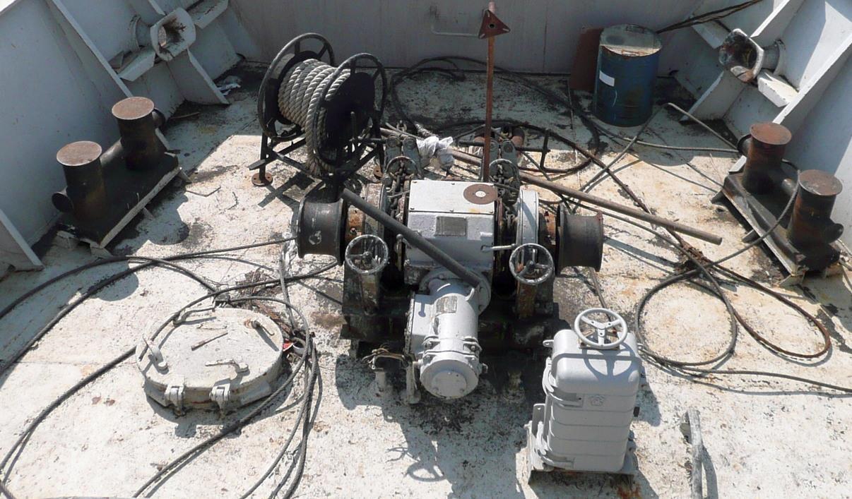 Это носовая часть палубы судна. Здоровенная штука в центре и есть брашпиль. С его помощью вытаскивают якоря, он помогает при швартовке и прочее. Очень тяжёлый и неубиваемо надёжный. Естественно, он устанавливается на могучий фундамент, через его звёздочки проходят якорные цепи, он подключается к электричеству… все дела. Сложно, но можно, если нужно.