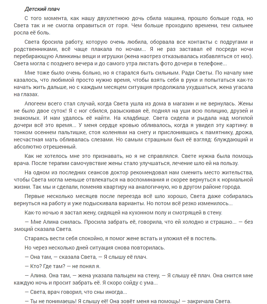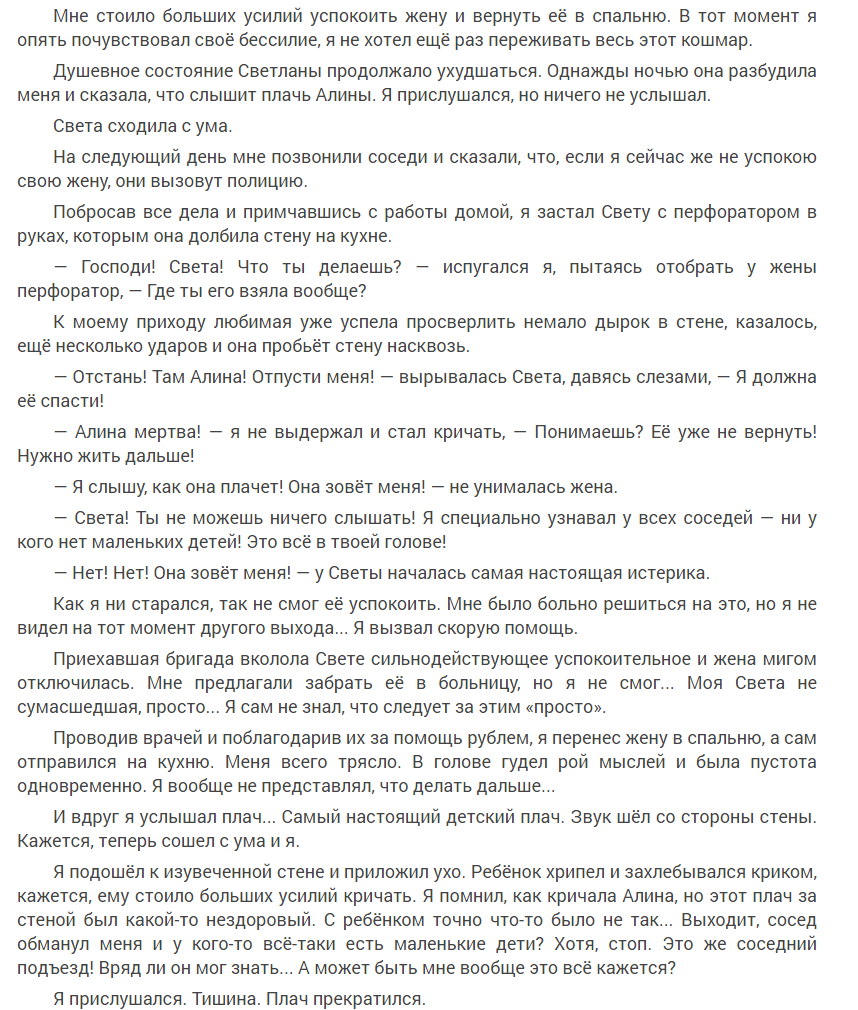 теперь, упрощаем рассказ до состояния Амебы. семейная пара слышит подозрительные шумы из соседней квартиры. вызывают ментов. в квартире кровь кишки распидарасило. из квартиры спасают ребенка. герой молодец, ребенка спасли благодаря высшим силам.