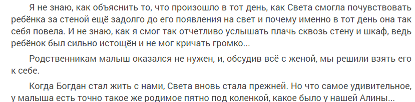 Спустя месяц убийцу нашли и посадили далеко и надолго. А мне вручили благодарственное письмо за спасение человека. Благодаря мне спасли ребенка, но я часто задаю себе вопрос: «Благодаря мне ли?». Кто-то или что-то хотело, чтобы ребенок жил. Я никогда не верил в высшие силы, но после этого случая я понял, что мы всего лишь пешки в какой-то большой и странной игре, правила которой человеку никогда не понять.