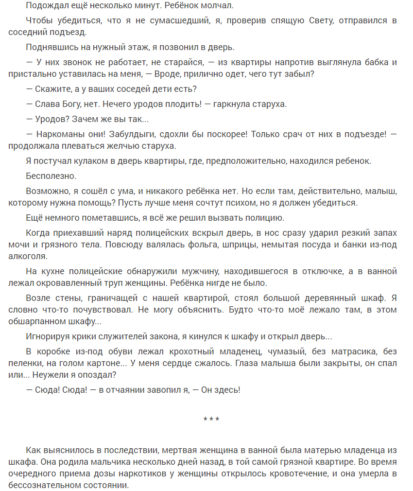 Но сил и желания заходить в другую комнату у меня не было, так что я стоял и ждал в подъезде вместе со взломщиком. Через минуту второй полицейский вышел из квартиры, неся в руках какой-то сверток. Я встал и, увидев живого ребенка, обомлел.