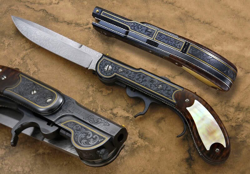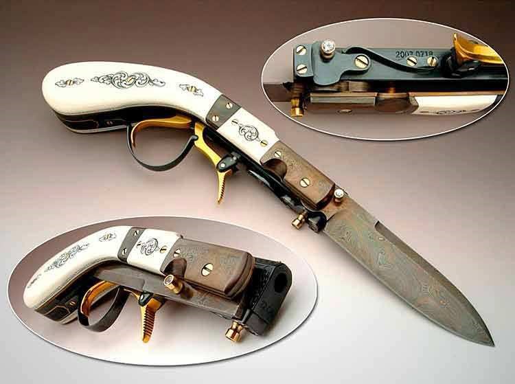 Если хотите построже, то есть и чёрненькие стреляющие ножики. Точнее капсюльные пистолеты с ножиками. Они тоже красивые, булатные и элитарные: