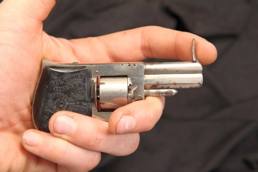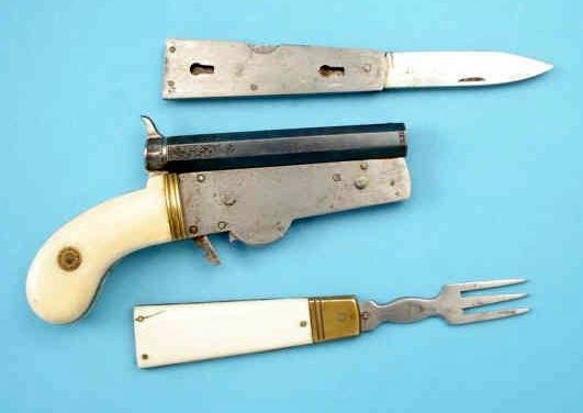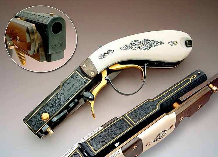 А вот ещё в Америке во времена Кольта, кроме «дерринджеров» сделали ещё одну однострельную стрелялку, которую тоже можно было использовать, как вполне удобный кастет (кстати слово "кастет" означает что-то типа "проламыватель головы"):