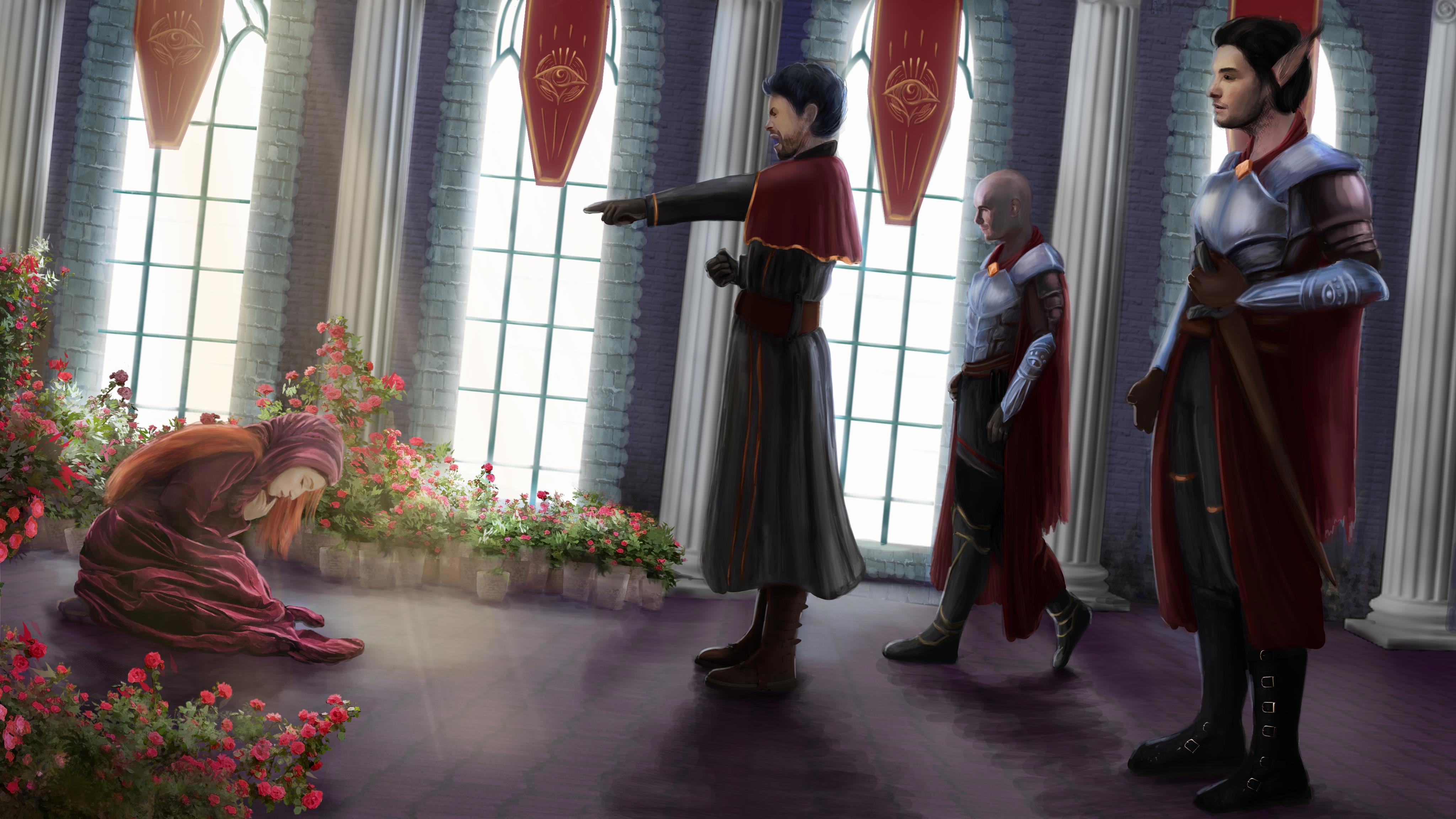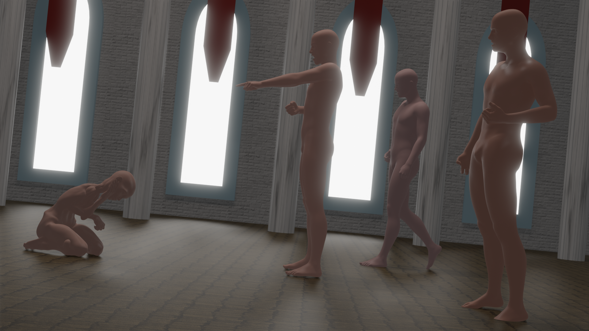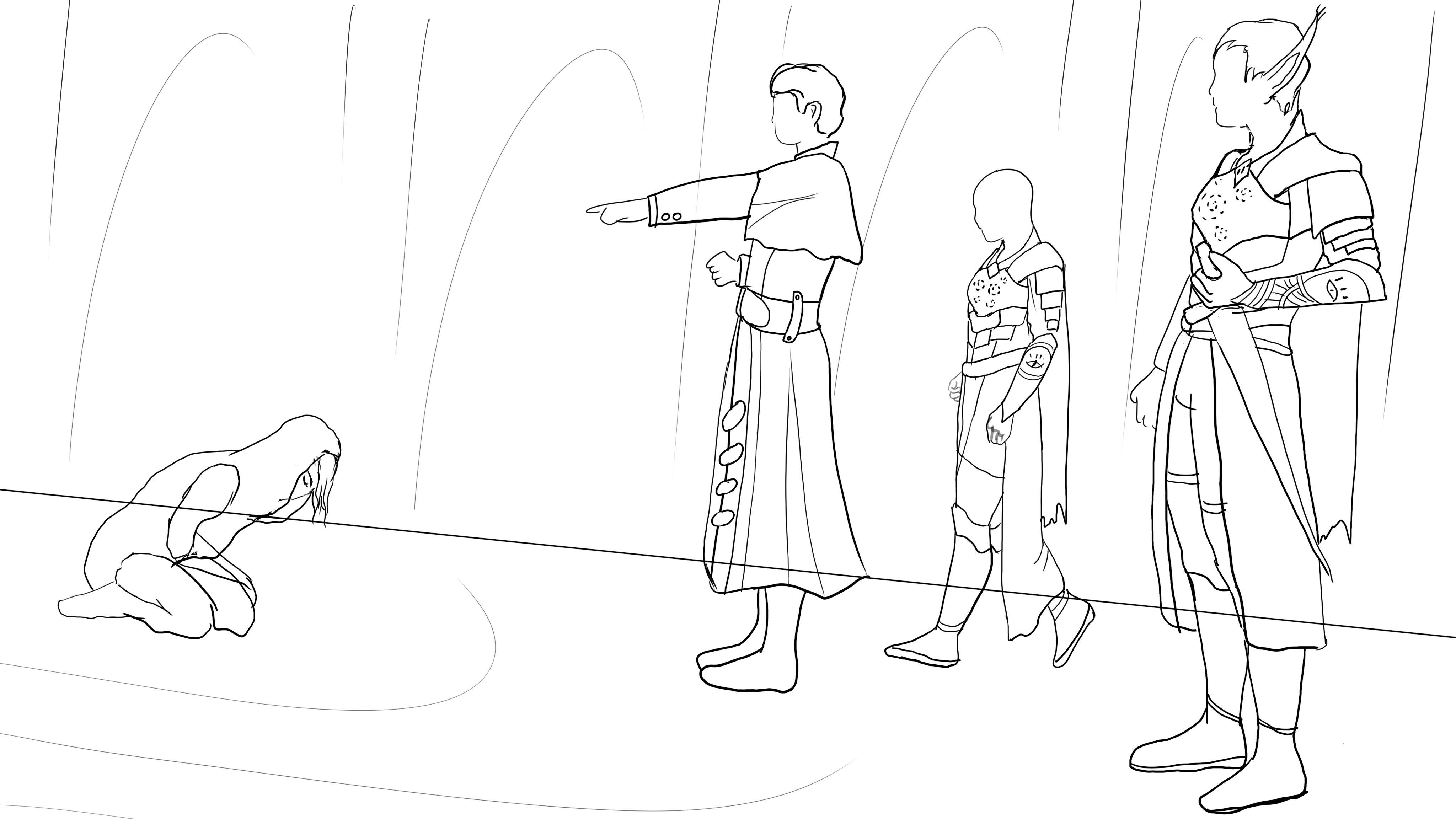 Итак, в первую очередь прорабатываю концепт. Быстрый набросок. Я хочу сделать четырех персонажей в огромном зале с большими окнами.