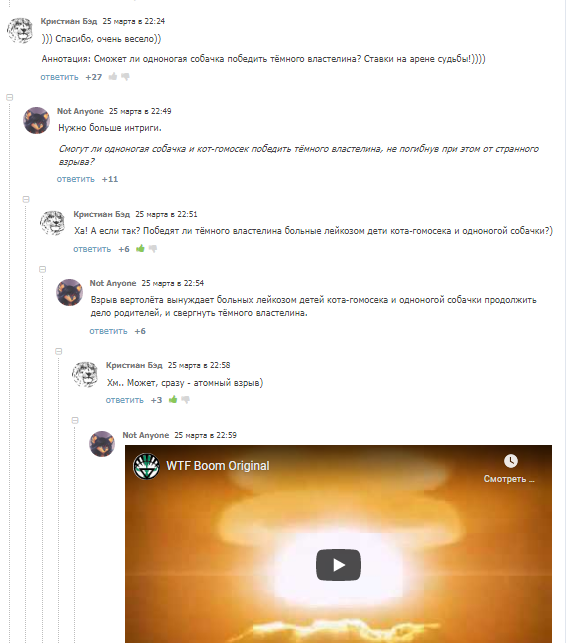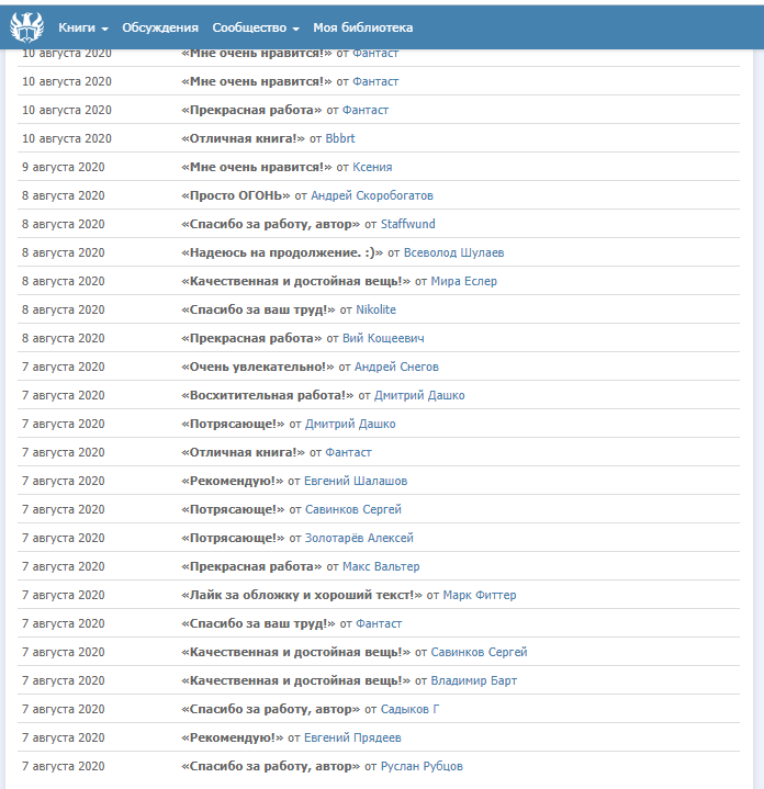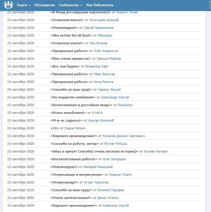 Сначала на сайт начали выкладывать десятки рецензий, напоминающих комментарии к развлекательным скрижалям вот какого типа — «Я читал ваш кодекс, но кодекс Эреба Вульпеса кодексатее, с ним вы можете ознакомиться в этой библиотеке, вот вам ссылка на неё».