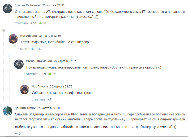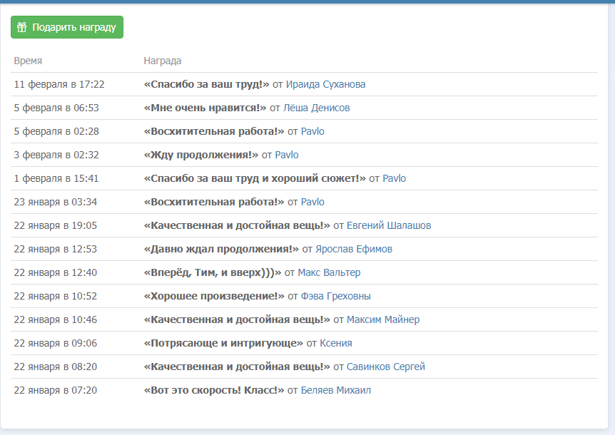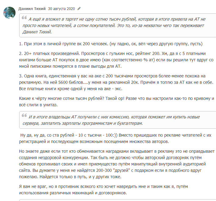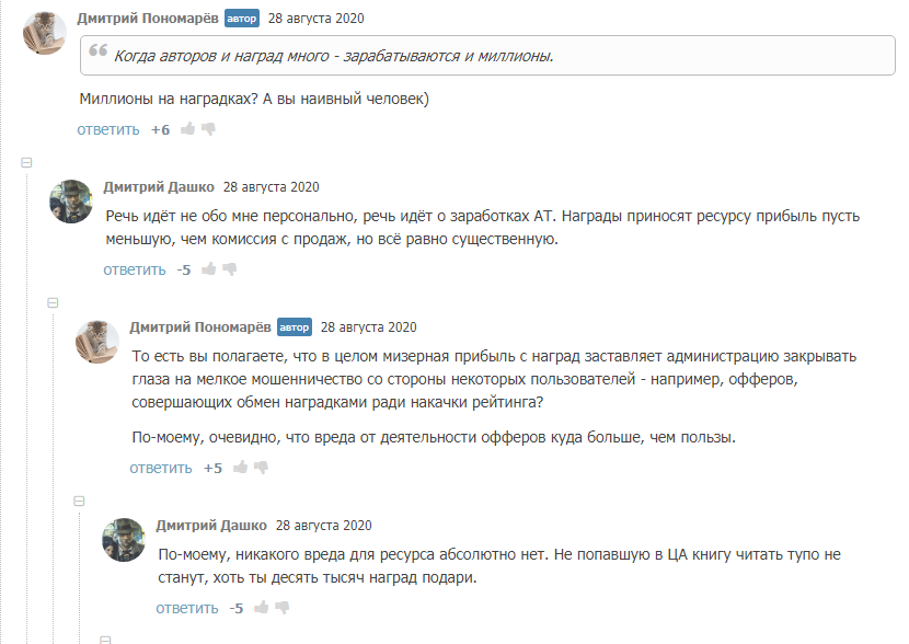 Делалось это следующим образом — организовывалась группа людей, которая дарила друг другу награды, выводя книгу в виджеты на главной странице; позже деньги возвращали дарителю (минус процент сайта, само собой; скриншоты с попрошайничеством наград будут представлены ниже). Ныне эта особенность АТ ликвидирована, но некоторые успели ей воспользоваться и вылезти из праха и ничтожества на вершины коммерческого успеха.