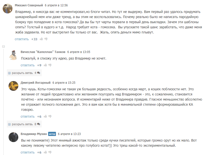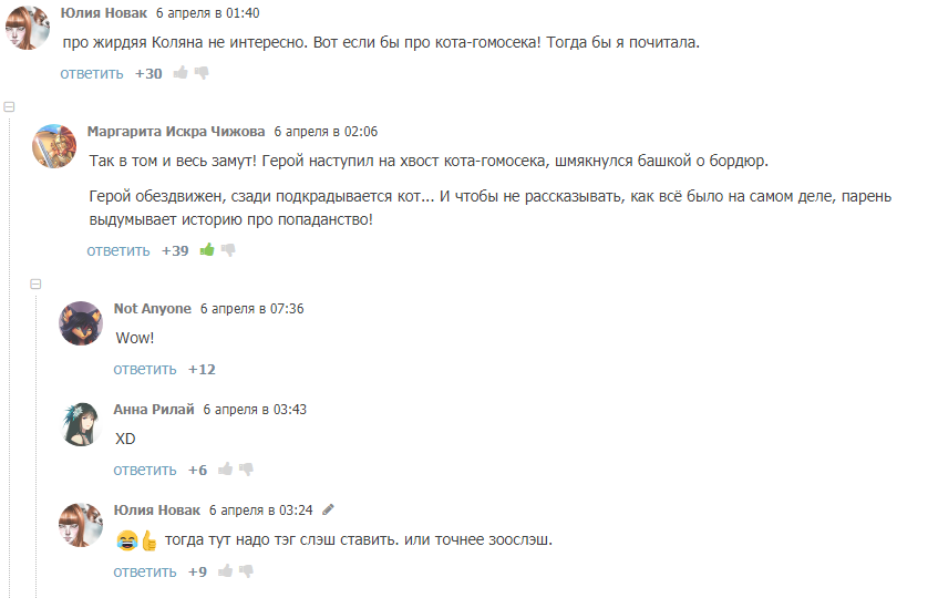 Также Кот-Гомосек удостоился отдельного литературного произведения, в котором стал главным действующим лицом. Желающие могут узреть сию скрижаль в профиле Вульпеса.