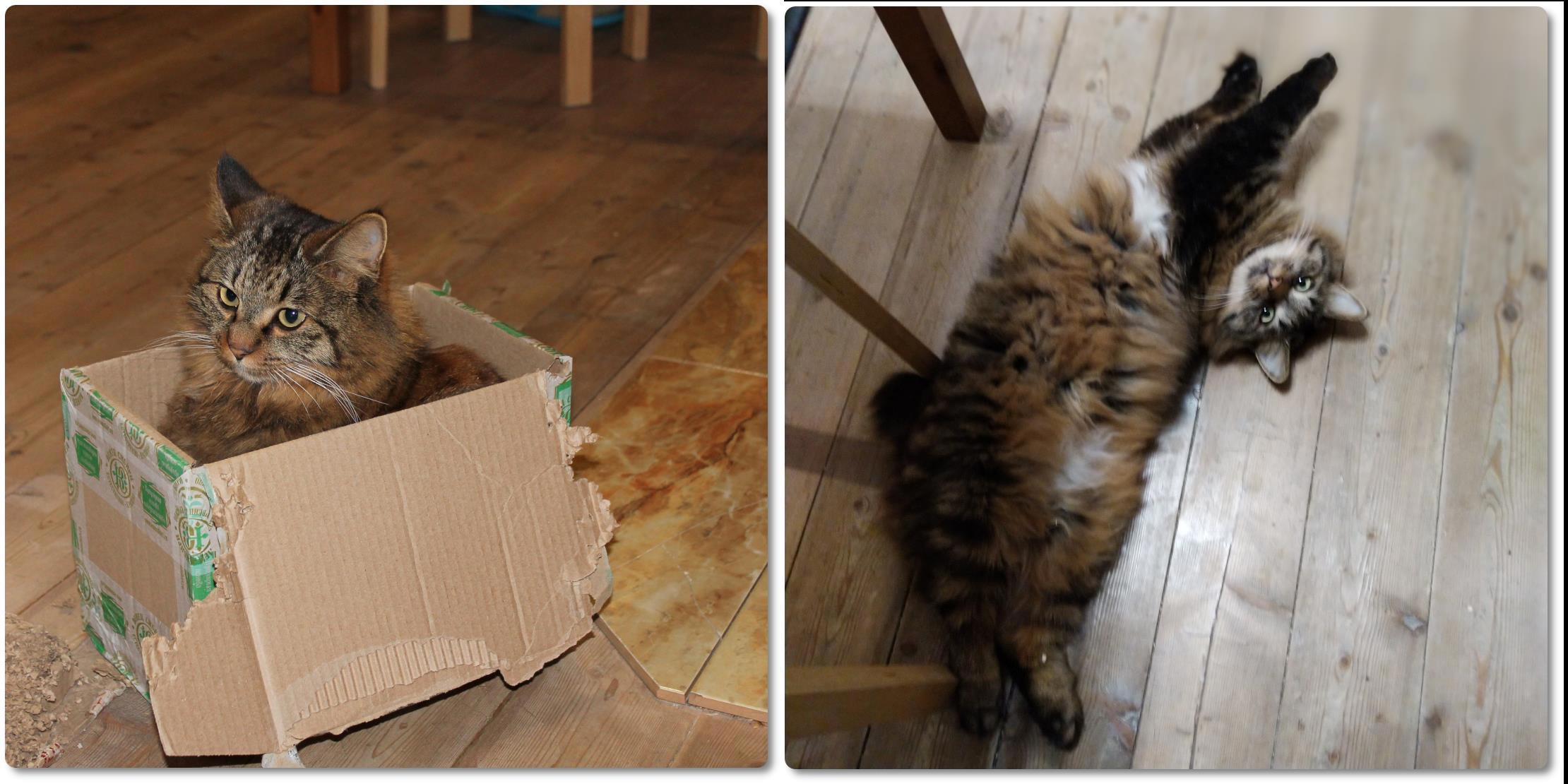Но вскоре, конечно, кошечка смиряется, что лето кончилось, и на улицу, где холод, выходить перестаёт. Манин великовозрастный сынок Фима в отличие от мамы на улицу не рвётся, спит себе спокойно, ему хорошо. А Манечке дома скучно. Делать-то нечего, мышей нет, игрушечные мышки настоящих не заменят. Спать всё время, как лентяй Фима, активная кошечка не может. Вот и начинает она по дому слоняться. Подойдёт к мисочке с едой, постоит задумчиво: «Нет, есть ещё не хочу!» Подойдёт к водичке: «Нет, и пить не хочу!» К лотку подойдёт: «Нет, и сюда ещё рано. Что же сделать-то? А, придумала, поваляюсь-ка!» И Маня начинает кататься по полу. Но тут за окном слышится лай нашей собаки Занны. И Маня, и Фима мчатся к окну. Пропустить такое событие, как появление рядом с нашим домом редкого прохожего, они не могут! А ведь иногда по дороге за окнами гуляют собаки с их хозяевами, а то и лошади с седоками! Собака наша при этом чуть цепь не рвёт, заходясь в возмущённом лае. Это для наших котиков, как в театр сходить. Жаль редко такие события случаются. И опять нужно придумать, чем себя занять. Вот разве что зубки поточить — коробочку погрызть. Зубки у бобтейлов что надо! Занятие это — одно из любимых. И если бы не было спасительных картонных коробочек, наверное, многие вещи в доме могли бы существенно пострадать. Но мы приучили наших грызунов к коробочкам, и они послушно уничтожают только эти предметы. Особенно любит это дело Маня, которая погрызушками может заниматься часами. Она залезает в коробочку и начинает с остервенением откусывать куски картона. Куски эти разлетаются во все стороны. Бортики коробки постепенно становятся всё ниже. Когда остаётся практически только дно, мы подсовываем им новую. Вот так и коротают зимние дни наши бобтейлы, всеми силами кошачьей души ожидая прихода тепла. Жаль, что у нас в Сибири зима-то длинная, а лето короткое…