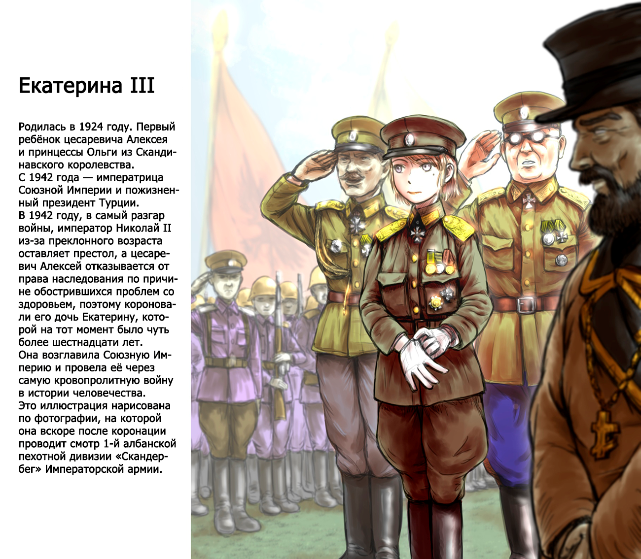 Вот одна из главных героинь - великая княжна Екатерина, будущая императрица России Екатерина Третья. Любительница всяких гремящих железяк вроде танков и просто хорошая девочка, ухитрившаяся очаровать немецких танкистов во время визита в их часть.