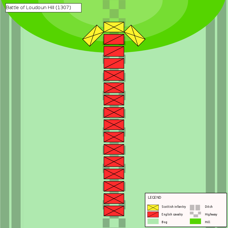 (битва при Лаудон-Хилле, схема. Англичане выстроились в очень глубокий клин, но даже таким способом не смогли прорвать строй копейщиков-шотландцев)