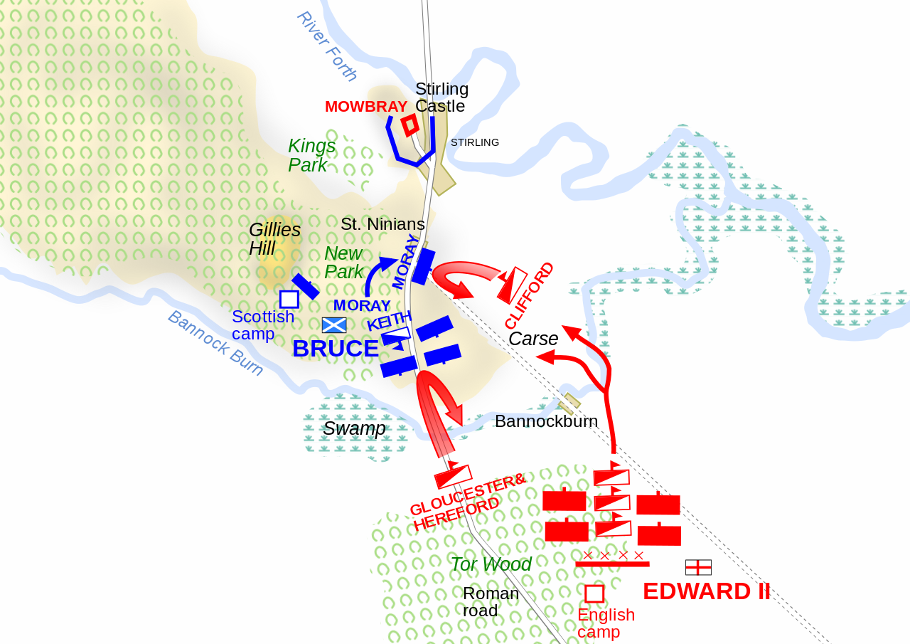 23 июня английские войска достигли реки Бэннокбёрн в нескольких километрах к югу от Стерлинга и знаменитого Стерлингов моста через реку Форт. Шотландская армия под предводительством короля Роберта I расположилась чуть севернее на лесистых холмах, окружающих дорогу.