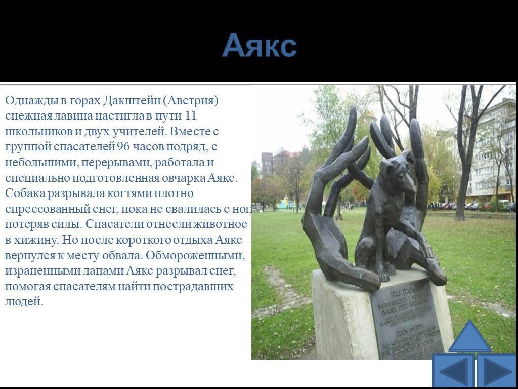 Среди самых достойных четвероногих спасателей – Аякс, как говорят о нем - "герой Дахштейна". В горах Дахштейна в 1954 году лавина застигла в пути 11 школьников и учителя. В спасательной группе оказалась овчарка с именем древнегреческого героя. Аякс работал 96 (!) часов подряд. Он скреб когтями и разрывал слежавшийся снег, пока не свалился от изнеможения. Лапы его были стерты до кости и обморожены. Аякса отнесли в горную хижину, чтобы сделать перевязку. Но пса нельзя было удержать под крышей. Он кидался на запертую дверь, скулил, а вырвавшись, стремглав помчался к месту обвала и откопал очередного человека.