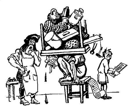 Во времена Гуттенберга печатали книги так: на деревянной доске вырезывали выпуклые буквы, намазывали черной краской и, положив на бумагу доску, садились на неё в роли подвижного энергичного пресса. От тяжести типографа и зависела чистота и чёткость печати.