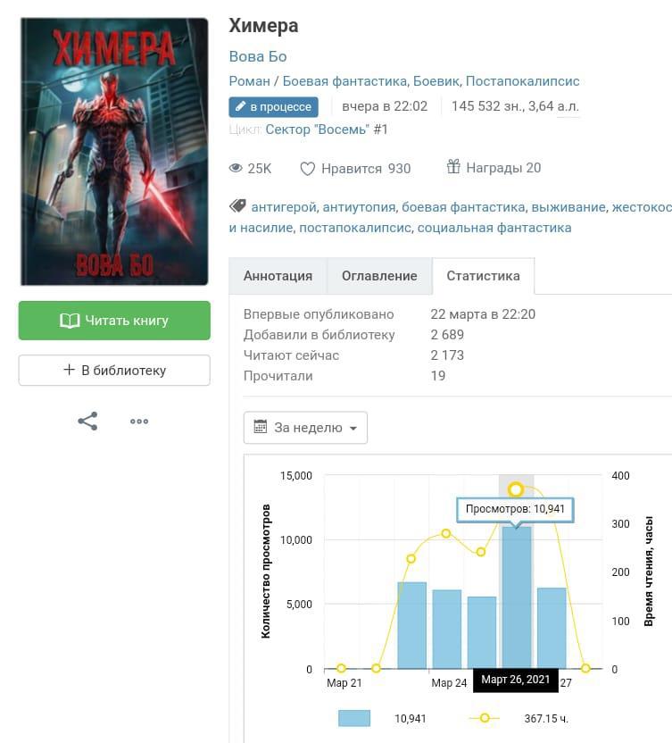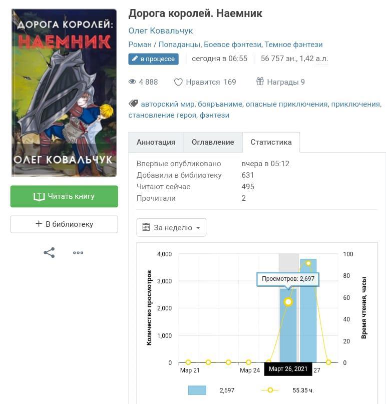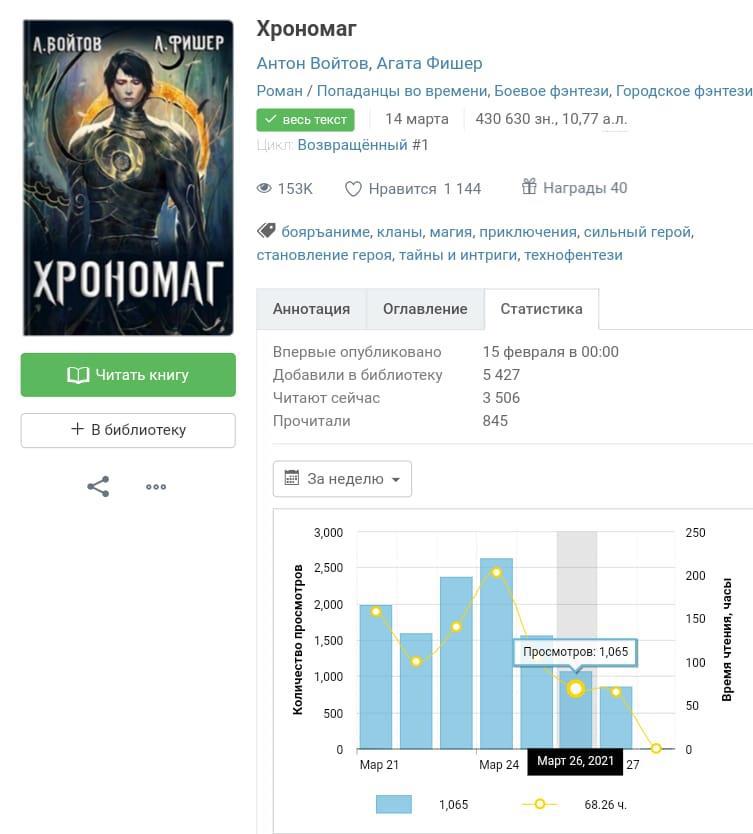 Книга встала в ГН спустя 12 дней после старта и затем поднялась в этом виджете до позиции топ-5. 1000 библиотек книга набрала меньше, чем за 2 недели.