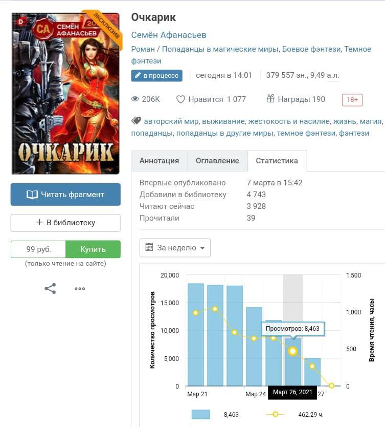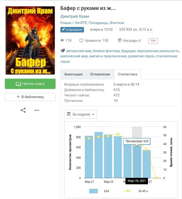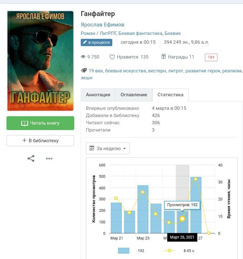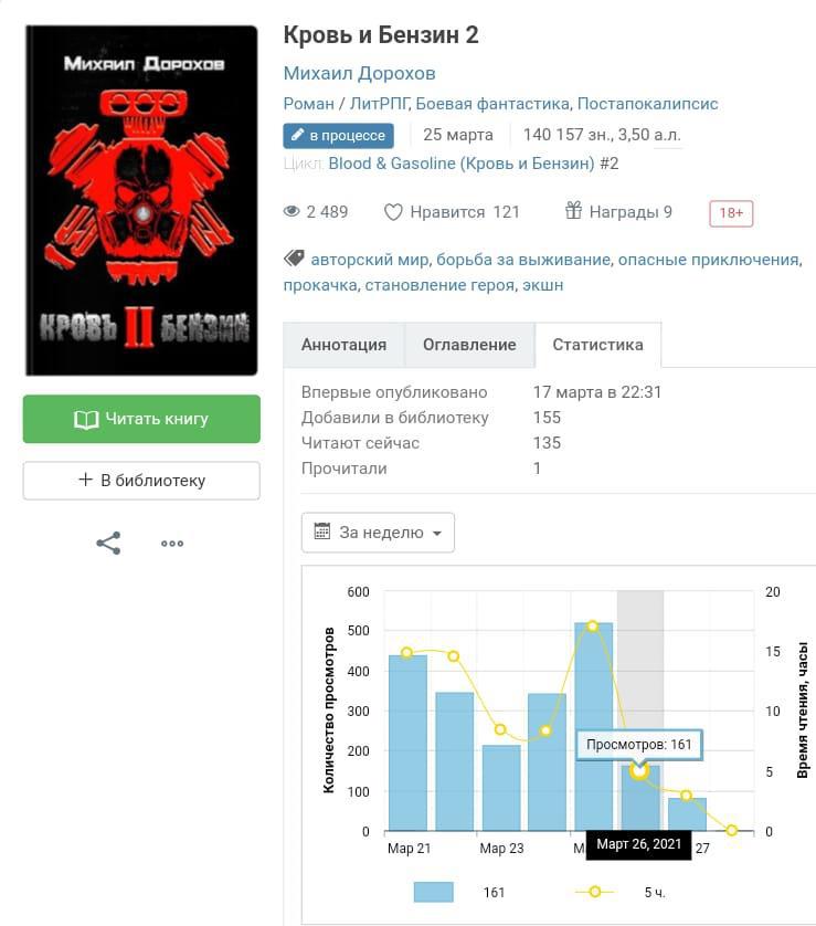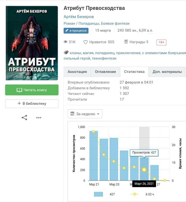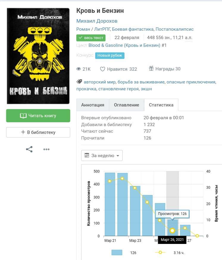 9. Михаил Дорохов. Публикуется на АТ с января 2018 года. На момент старта имел чуть больше 400 подписчиков, из которых более 300 были неактивны из-за двух крупных перерывов между выкладками книг. Встал с новой книгой в ГН на третьи сутки после её старта.
