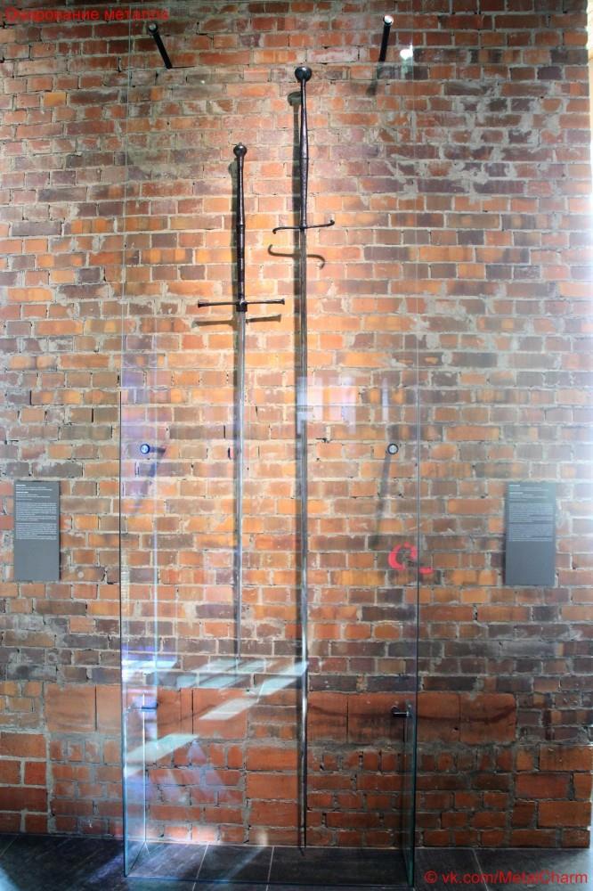 Из-за размера и веса этот меч эсток хочется, как и Норимицу, отнести к показушно-церемониальным предметам, если бы не два «но». Во-первых, о нём и втором, меньшем, эстоке на фото есть запись в инвентарной книге оружейной палаты. Она датируется 1606-м годом и гласит «Два длинных боевых меча с трехгранными длинными клинками, один с прямой, другой с изогнутой крестовинами в черных кожаных ножнах». А во-вторых, присмотритесь к фото крупным планом. Оружие, пережившее последние четыре столетия в «тепличных» музейных условиях покрыто зазубринами и вмятинами. Если бы оно пролежало где-то в земле — не вопрос, там всё обычно в куда худшем состоянии. Но этот эсток то просто висел на стене. Возможно, прежде чем туда попасть, он успел побывать в деле. Хотя может быть это и просто издержки ручной ковки и свидетельства небрежности мастера, кто знает?