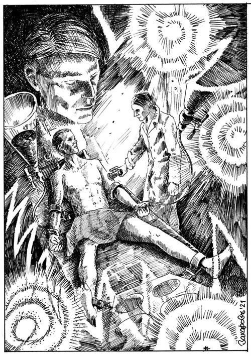 В этом сне пристёгнутый к стенду белый обнаженный Кальт, прикрытый до пояса ковриком из просвинцованной резины, беззвучно корчился в лучах медленно перемещающихся квадратных ламп. Пластиковые трубки, соединяющие его запястья с конусовидными капельницами, были заполнены чернильной жидкостью, нисколько не напоминающей кровь. Хаген не видел его лица. Оно было обращено к Лидеру, сгорбленному больному человечку, методично прикладывающему сенсорную иглу к распростёртому телу…