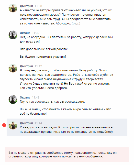 Мне мерзко, когда мне предлагают самому заплатить за свой же труд. За своё время, эмоции, переживания. Мне гнусно, от того что это считается нормальным, приемлемым. Отвратительно отношение к творчеству, как к самолюбованию, за которое нужно платить. Просто оскорбительно. Гнать этих паразитов нужно, бороться за уважение всеми силами. Фу на них.