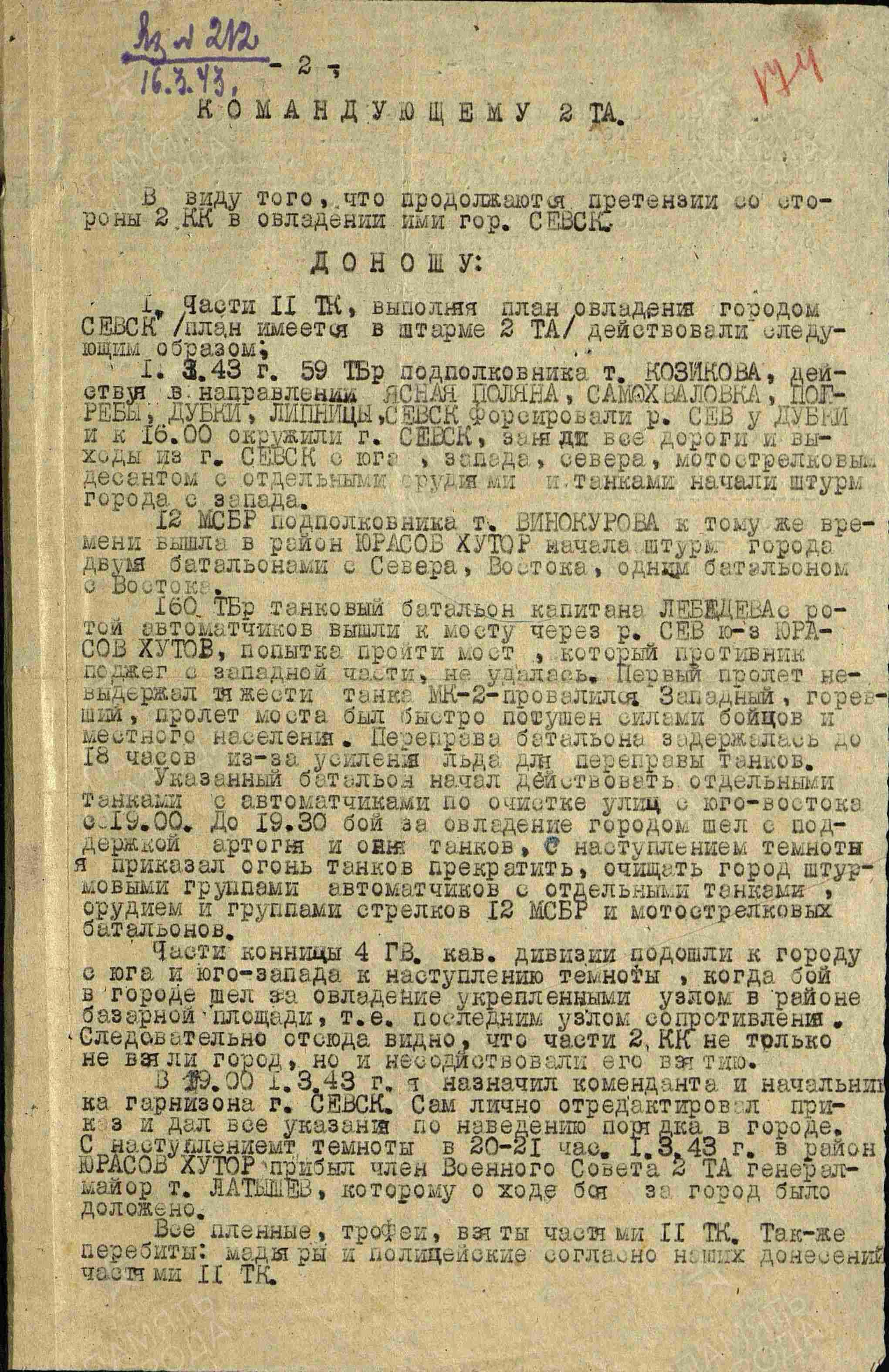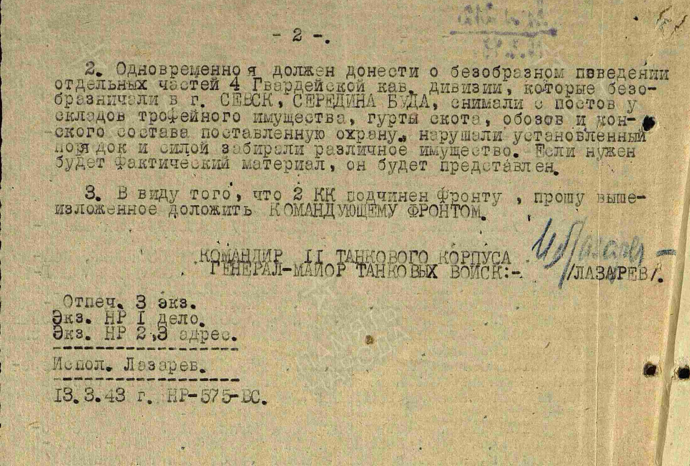 Впрочем, у конников Крюкова и с советскими танкистами сложились непростые отношения. Командир 11-го тк генерал-майор танковых войск Лазарев составил особый доклад, начинающийся со слов: " ввиду того, что продолжаются претензии со стороны 2 кк в овладении ими г. Севск доношу". По тексту видно, что ему очень хотелось написать, как кавалеристы обзывали товарища Рокоссовского "желтым земляным червяком", но он героически сдержался и написал только про учиненными ими безобразия.