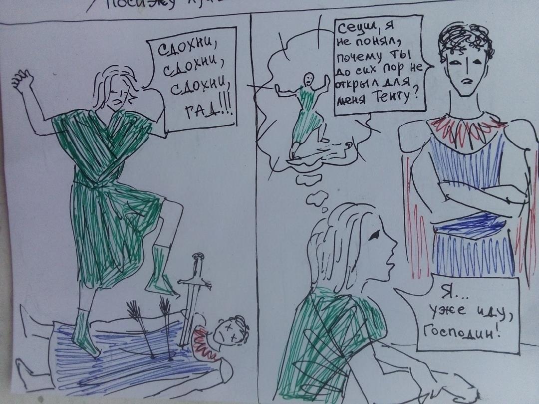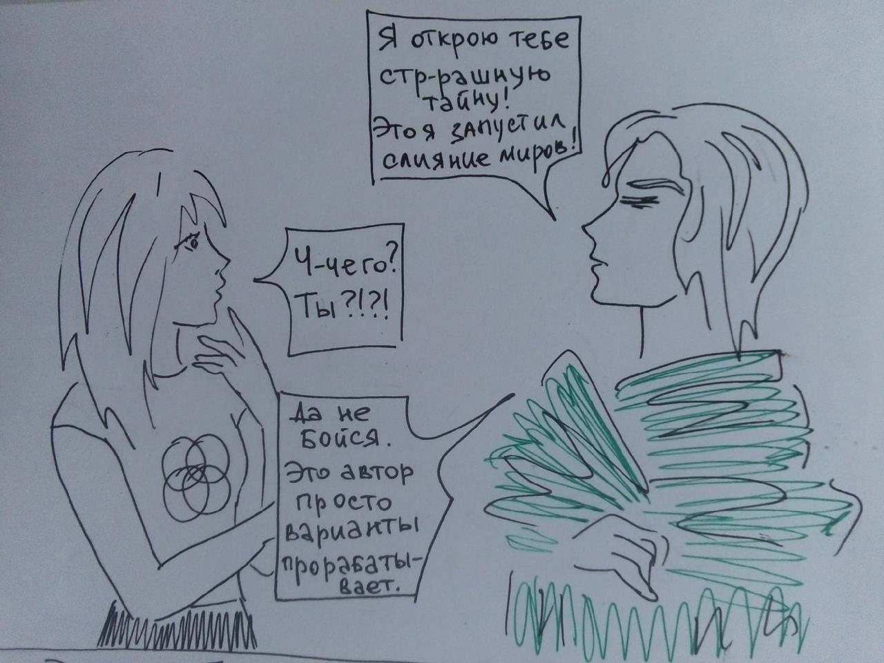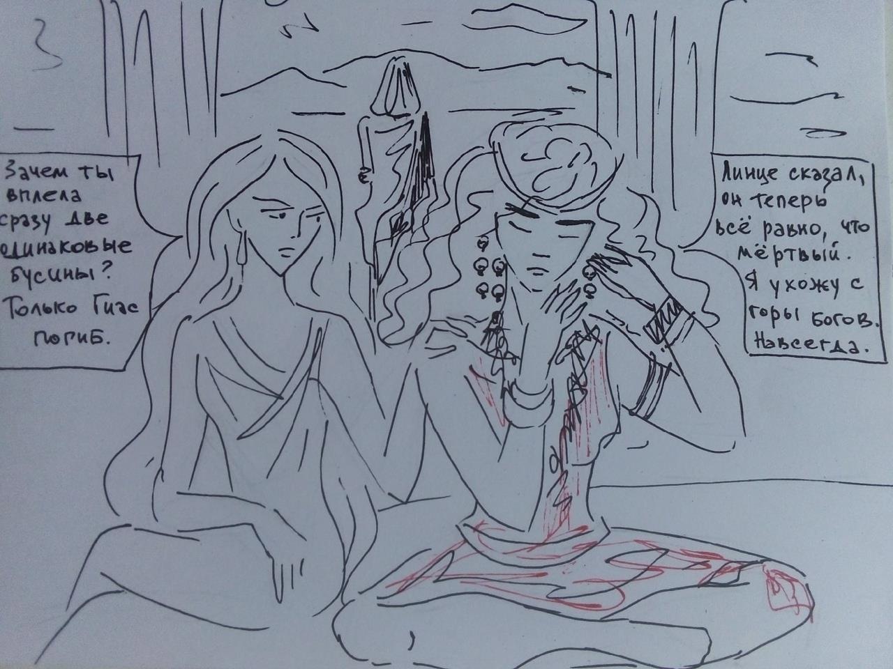 По заданию, мне нужно еще нарисовать сделку Исы и Эш-ты, свидание Юля с Верховным(!) И Верховного, пришедшего к Линце с цветами (!!!) Но сделка - это скучно, а свидание и цветы невозможно представить без выпадения персонажей из заданных характеров.