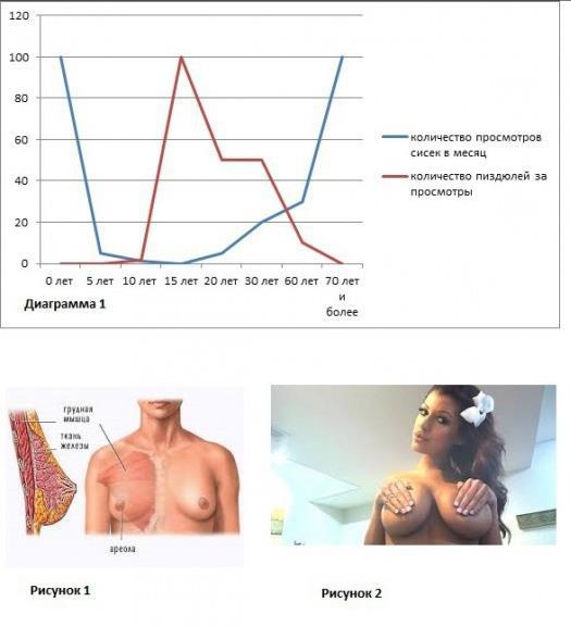 Как ясно видно из диаграммы, возраст от 13 до 18 лет - это возраст с крайне маленькой возможностью увидеть Сиськи, но, в то же время, возраст наибольшего количества пиздюлей за их несанкционированный просмотр. Стоит добавить, что желание увидеть Сиськи, достигает своего максимума лет в 10 и затем никогда уже не уменьшается. Мы сознательно не стали вводить этот параметр в диаграмму, так как его невозможно выразить количественно, стоит только сказать, что он стремиться к бесконечности.