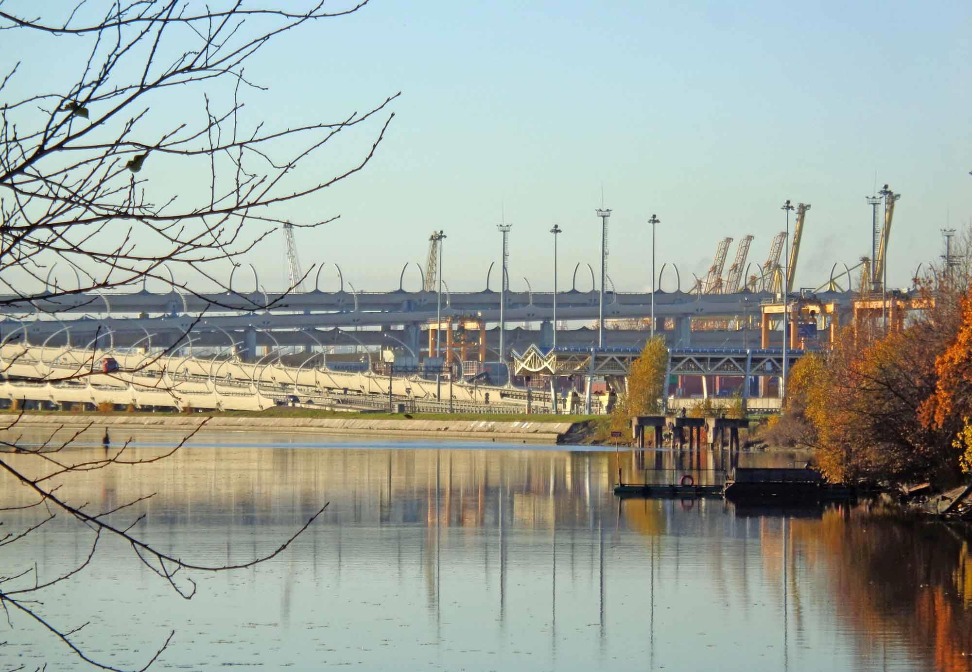Река Екатерингофка, за ней виднеется развязка ЗСД (фотографировала прошлой осенью):