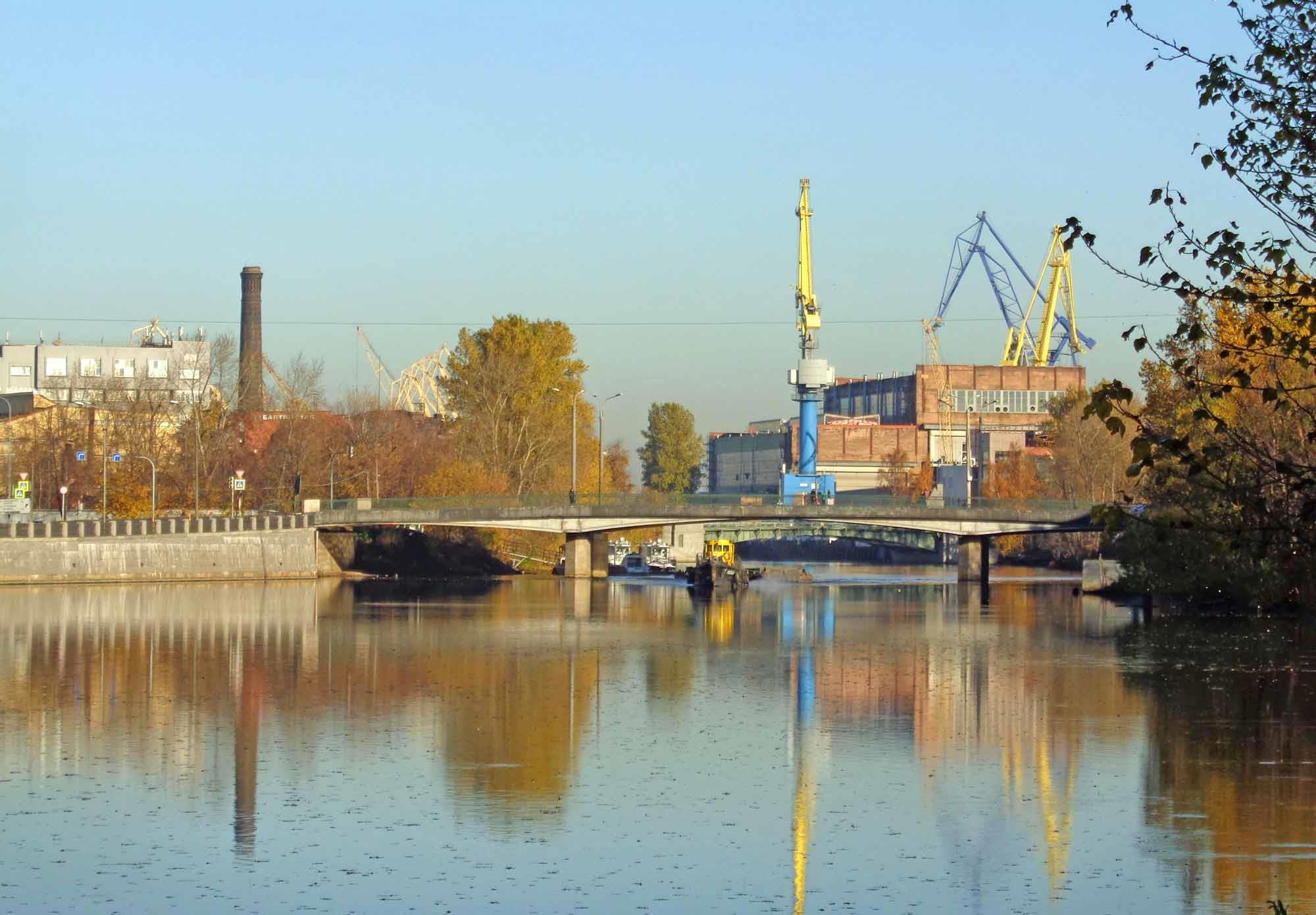 Та же Екатерингофка, но в сторону верфей и Гавани. Мостик - это место слияния реки в Обводным каналом: