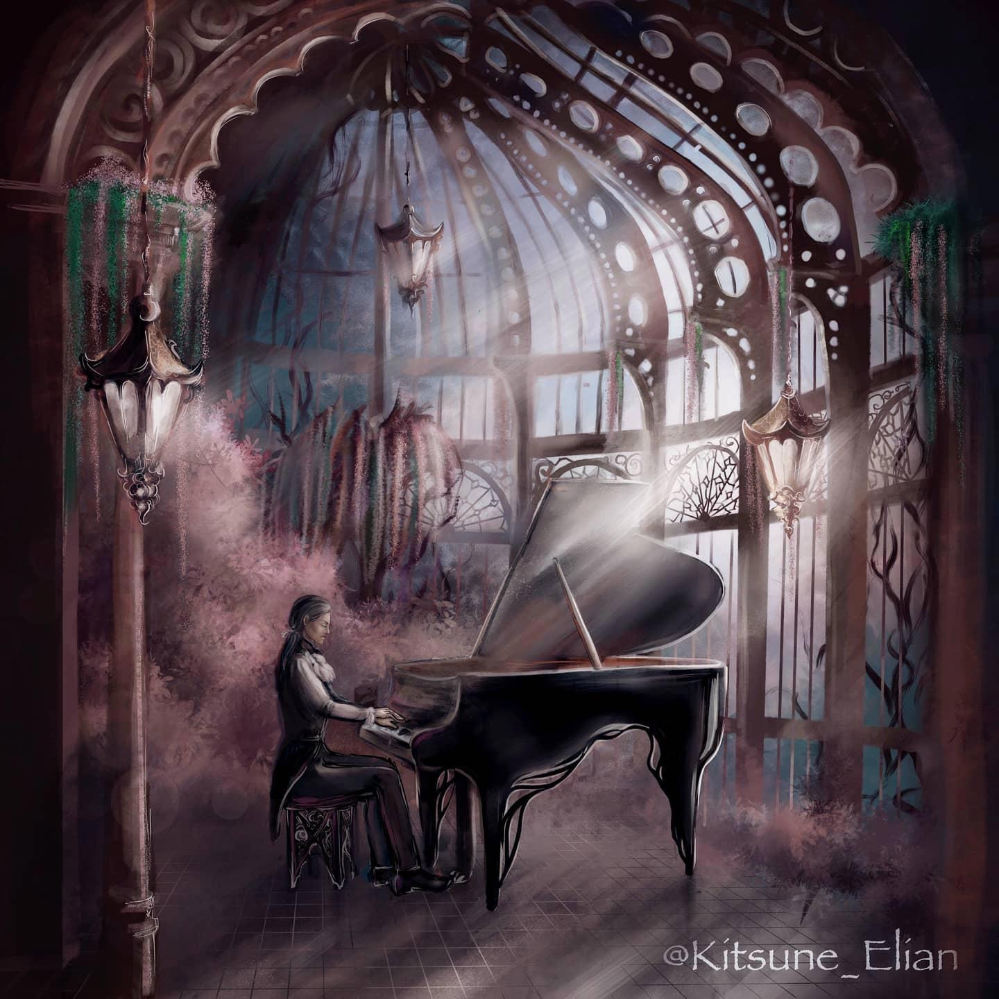 Раннее утро, традиционные занятия музыкой перед тем, как обратиться к насущным рабочим вопросам. Давайте проживём эти моменты вместе, любуясь чарующей иллюстрацией, созданной @kitsune_elian🤗