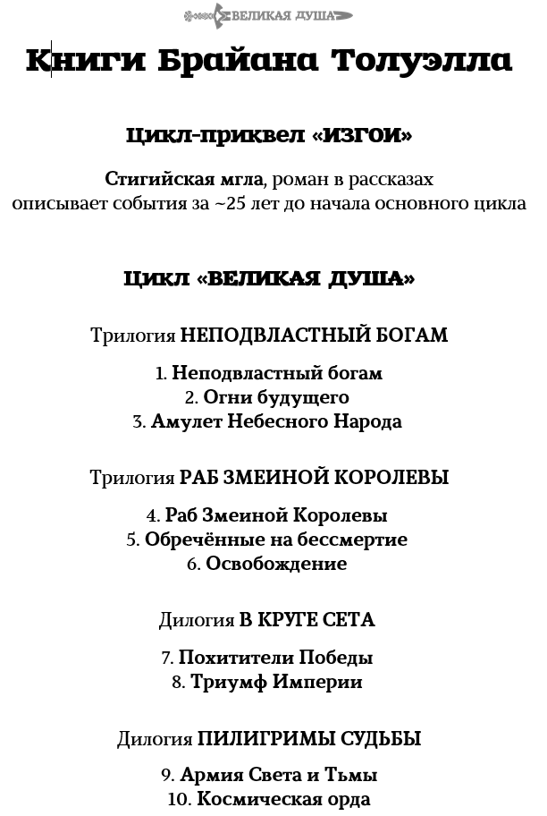 В настоящее время цикл «Великая Душа» состоит из двух трилогий и двух дилогий (последняя пока в работе), их можно читать по отдельности или как один непрерывный роман со сквозным сюжетом и общими персонажами. Уже сейчас, без заключительной дилогии, толуэлловская эпопея – самый большой и масштабный цикл во всей мировой Саге о Конане и мире Хайборийской эры. Я собираюсь дописать его и вынести на суд читателей.