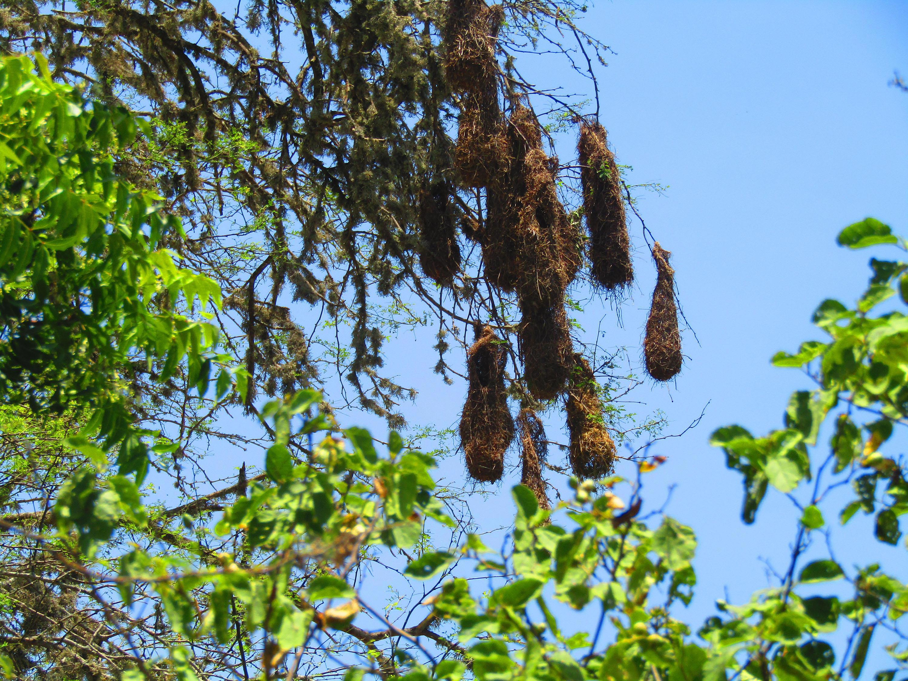 То, что раскачивается на дереве – не экзотические плоды, а гнезда желтоспинных - в некоторых источниках желтопоясничных черных - касиков. Птиц красивых и громко поющих, причем на разные голоса.