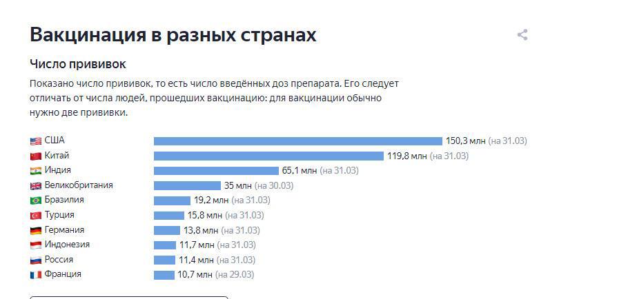 Это число прививок по странам, на первом месте США. А на втором Китай. Россия же хуже Бразилии и Турции, что совсем печально.