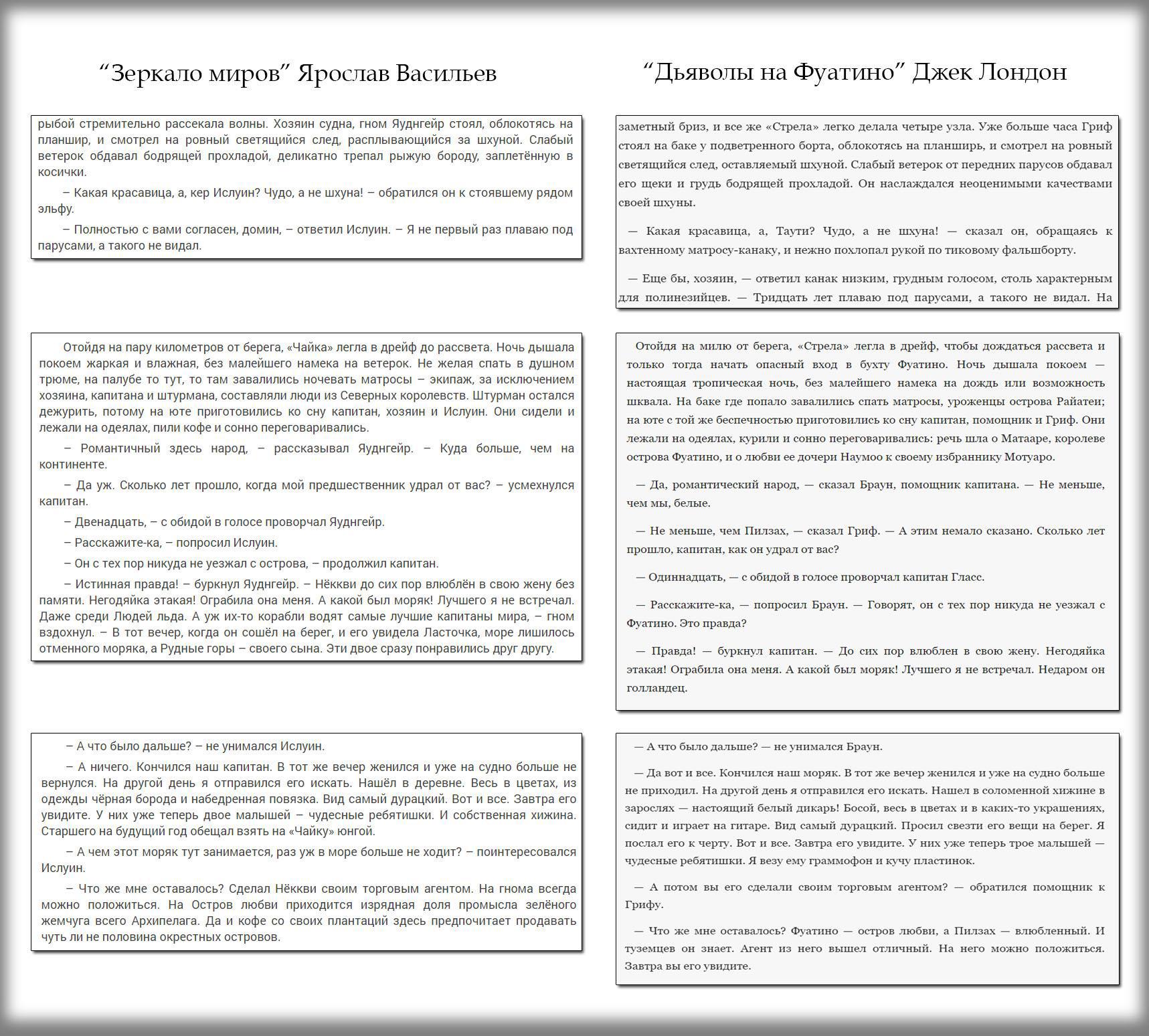 Джек Лондон, конечно, уже ничего не предъявит, по закону за такое заимствование уже ничего не грозит, поэтому нет смысла давать выдержки из статей. Даже обвинять в плагиате не хочу, потому что и без меня найдутся доброжелатели. Я просто хочу спросить, зачем так делать? Это нельзя считать фанфиком, потому что фанфик не подразумевает копирования фраз из канона, это не оммаж и не заимствование идеи. Это похоже на детскую игру.