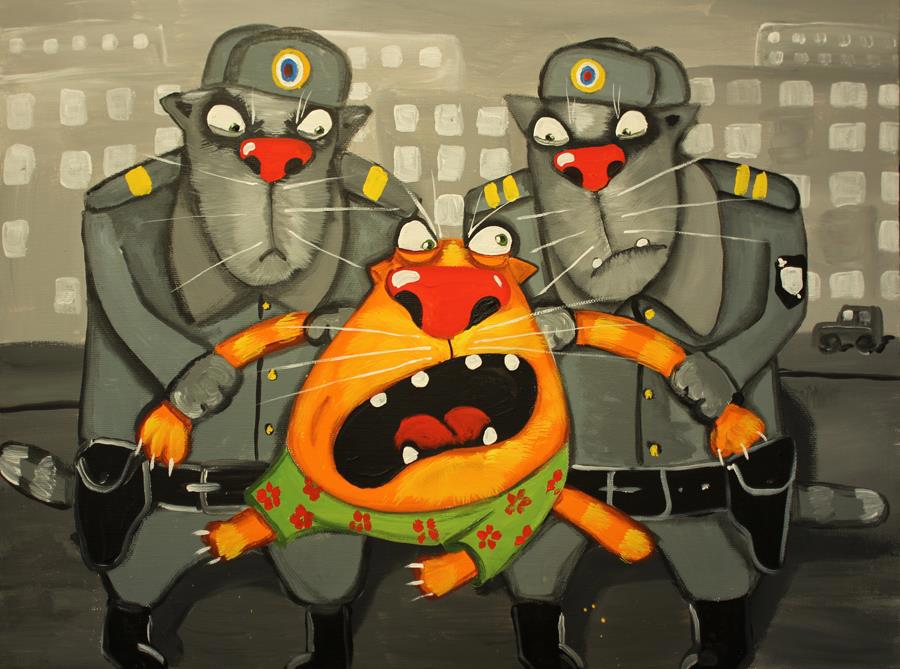 Только начали трудиться, тут прискакивает хозяин магазина. Он живёт неподалёку. И весь грозный такой - мол, по какому праву. Вторжение. Частная собственность. И прочая лабуда.