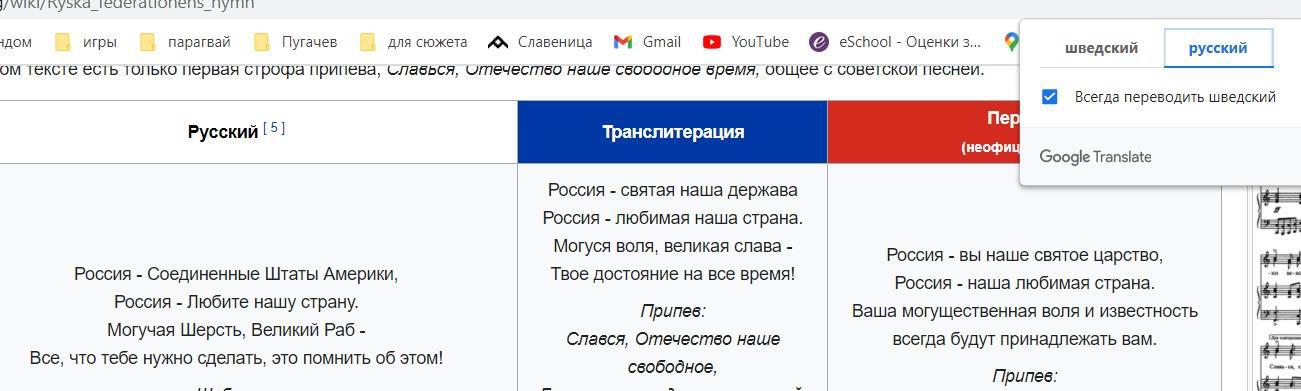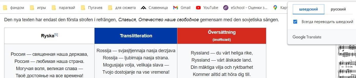 Как это постоянно происходит ищу информацию на национальных версиях Вики. Они обычно более богаты фактурой. К сожалению ни чего не нашел. И просто мимоходом забрел на шведскую страницу государственного гимна России. А поскольку я хожу с включенным гугл-транслейтом то вижу странное: