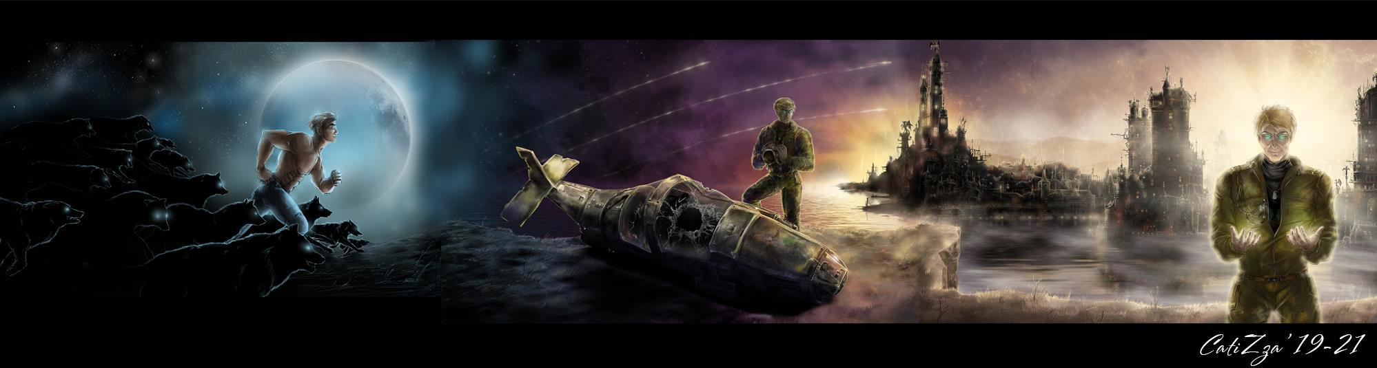 По задумке все три обложки соединяются в одну большую панораму, повествующую о путешествии Олега, как физическом, так и духовном, от тьмы к свету, в том числе и внутреннему, от пустых степей до густозаселенных человеческих городов. Обложки делались под полный разворот.