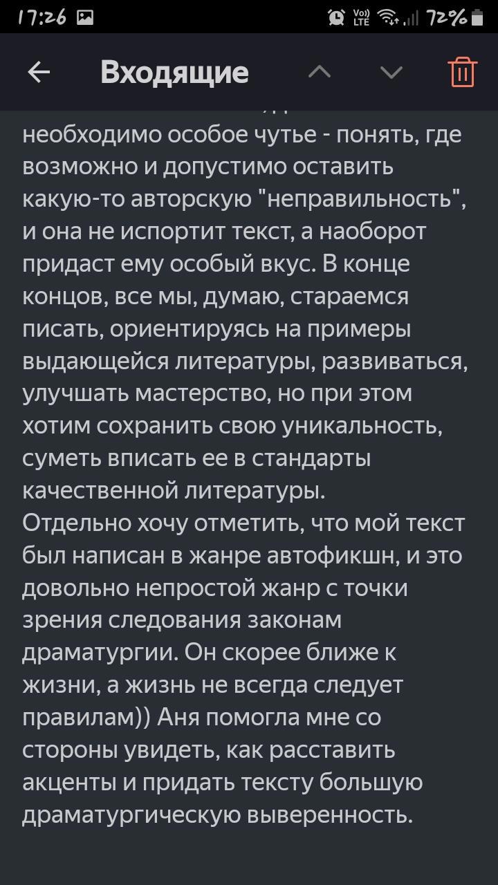 Отдельно хочу отметить, что мой текст был написан в жанре автофикшн, и это довольно непростой жанр с точки зрения следования законам драматургии. Он скорее ближе к жизни, а жизнь не всегда следует правилам)) Аня помогла мне со стороны увидеть, как расставить акценты и придать тексту большую драматургическую выверенность.