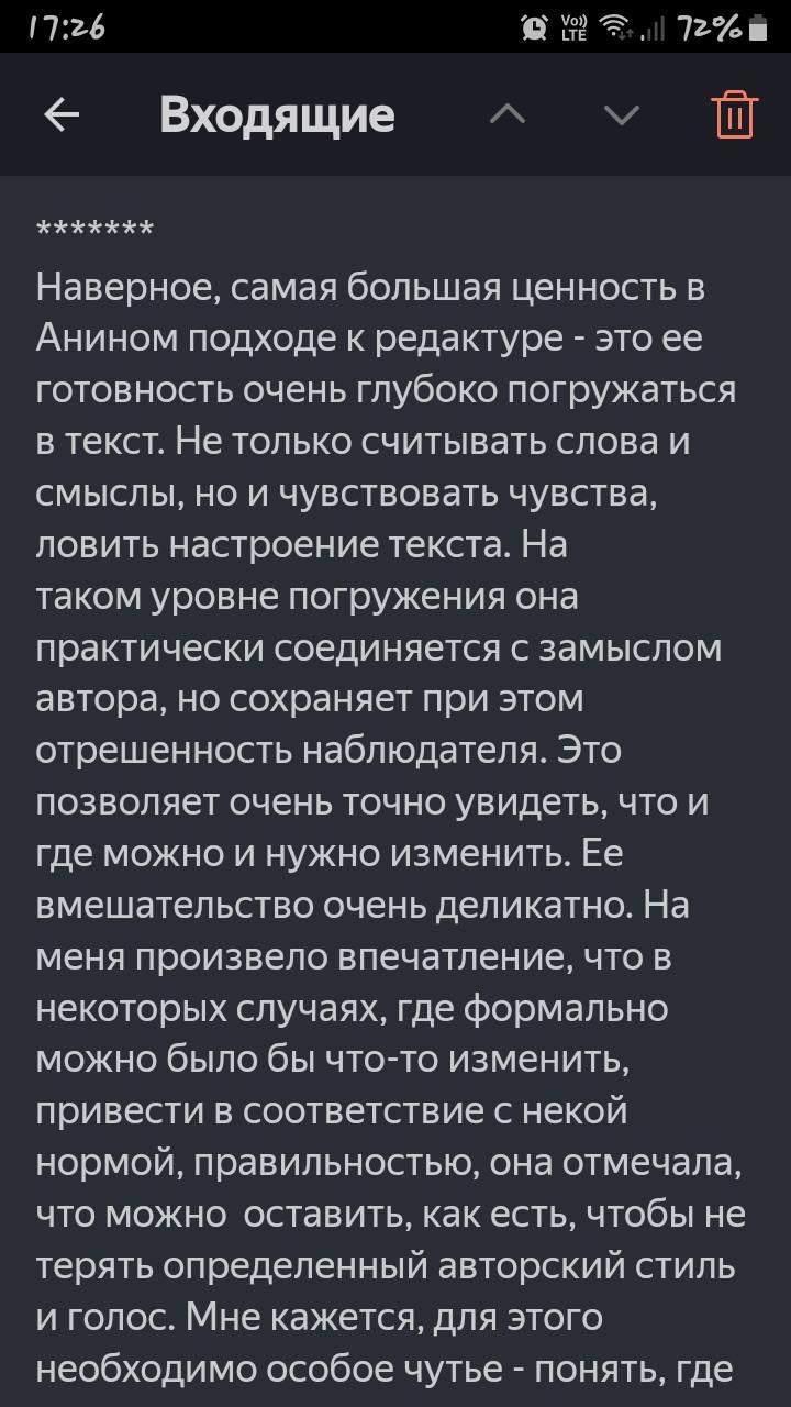 Автор: Анна ГутиеваУ меня тут такой тонкий отзыв автора на мою редакторскую деятельность, не могу не поделиться.