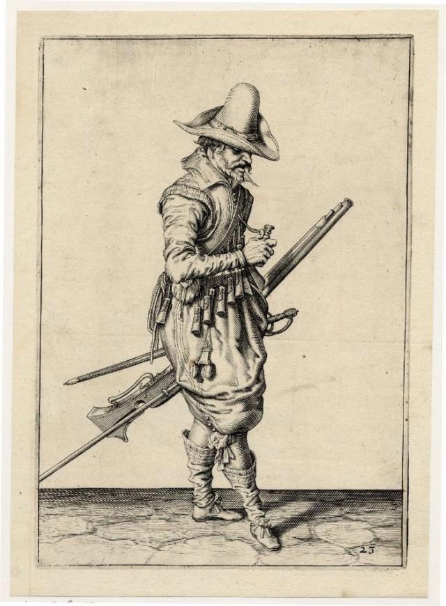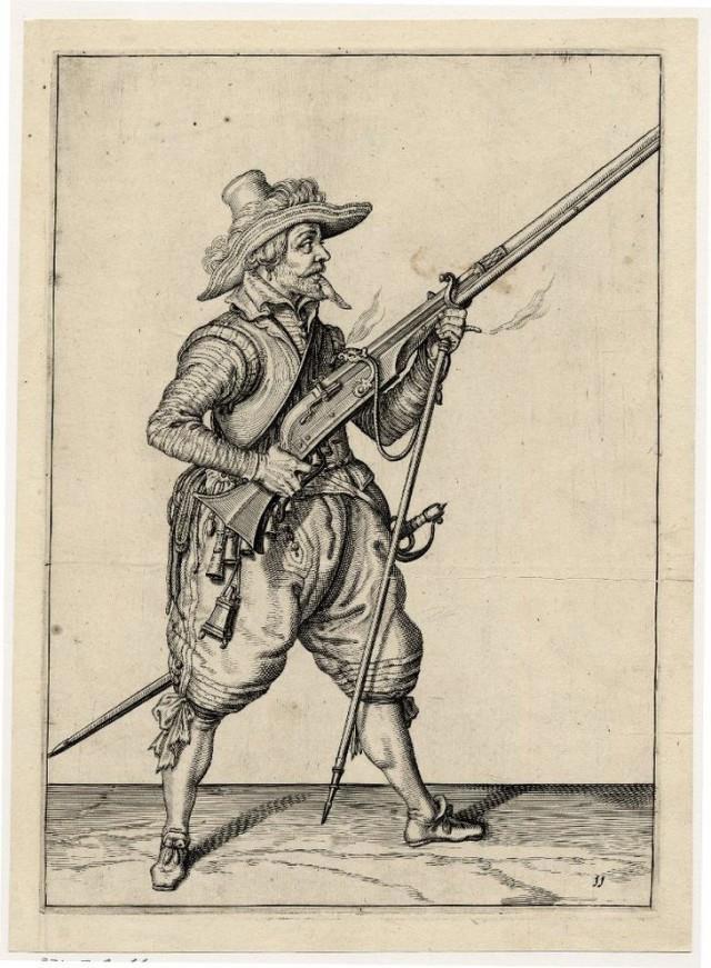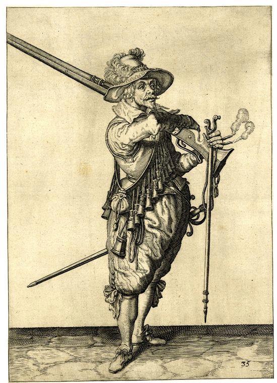 Вот гравюры голландского художника Jacob de Gheyn II начала 17 века. там он изображает мушкетеров так: